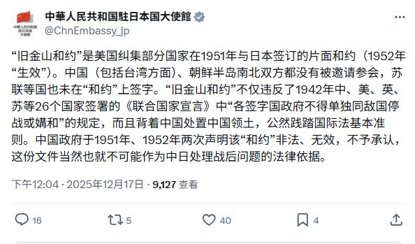 中国驻日大使馆今天发文:《旧金山对日和平条约》因排斥主要战胜国、内容违背国际正义,自诞生起就被中国等多国认定为非法无效。 “旧金山和约”的非法性在于其违反国际法基本原则和二战后国际秩序基础。1951 年 9 月 8 日,美国纠集 48 个国家与日本在旧金山签署该条约,次年 4 月 28 日条约生效。值得注意的是,作为抗击日本法西斯的主要战胜国,中国被彻底排除在缔约进程之外;苏联、波兰和捷克斯洛伐克因反对条约的片面性,也拒绝签字。 条约表面旨在解决日本的领土及国际地位问题。其中领土条款规定,日本承认朝鲜半岛独立,并放弃对台湾、澎湖、千岛群岛、库页岛、南沙群岛、西沙群岛等岛屿的主权。但关键缺陷在于,条约对这些被放弃主权的领土归属刻意模糊化处理,未明确台湾等领土的归还对象。同时,条约还基本免除了日本的战争赔偿责任,且签订当天美国与日本还单独签署《日美安全保障条约》,确立了美军长期驻扎日本的模式。 这份条约违背了《联合国家宣言》中禁止与敌国单独签订条约的规定,也无视《开罗宣言》《波茨坦公告》等明确台湾等领土归属中国的国际文件,这份非法的条约也成为日本的制造争端的依据。它还将琉球群岛交予美国代管,1972 年美国又将琉球群岛施政权 “归还” 日本,而钓鱼岛也被牵连其中。 自条约签署起,中国政府就明确否定其合法性。1951 年 9 月 18 日,中国就指出条约因无中华人民共和国参与准备、拟制和签订,是非法、无效的,绝对不能承认。此后多年,中国在多个国际场合反复重申这一立场。2025 年 8 月,外交部发言人毛宁再度强调,该条约是美国纠集部分国家对日本单独媾和的非法无效文件,任何妄图以该条约否定台湾属于中国的行为,都违背历史与法理事实。 日本和台独势力通过引用非法的条约制造争议性话题,本质上就是错误的行为。他们的行为无非就是想搅乱局势,但是他们的想法还是太幼稚,根本无法撼动一个中国原则的事实。日本右翼势力企图利用该条约突破战后国际秩序束缚,为其军事扩张和地区霸权野心服务。 国际法的基本准则不容破坏,非法条约永远无法取代具有合法效力的国际文件。我们必须保持高度警惕,揭露台独与外部势力勾结的本质,同时不断强化一个中国原则的国际共识,共同维护战后国际秩序和地区和平稳定。