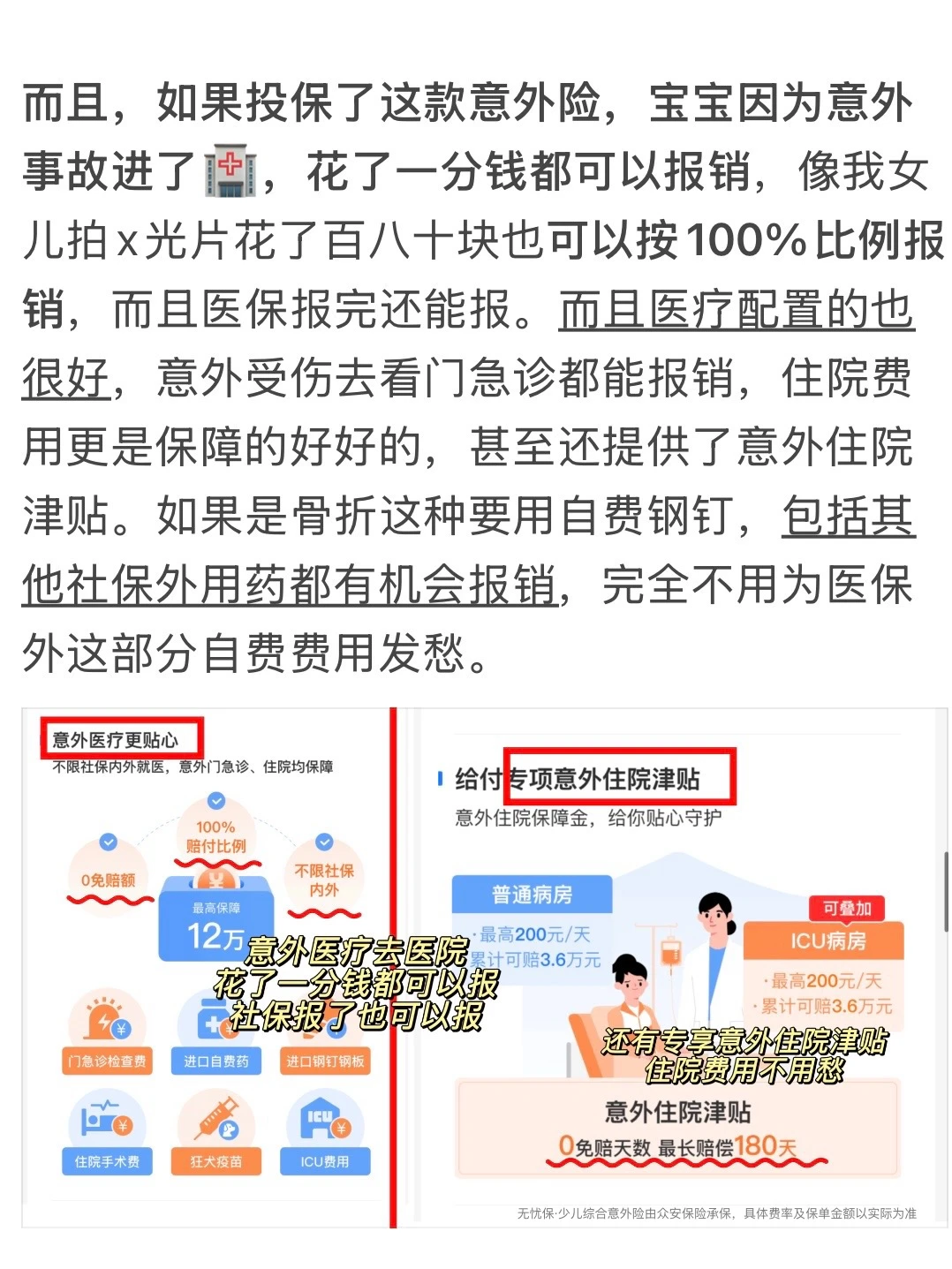 而且,如果投保了这款少儿意外险的话,宝宝因为意外事故进了🏥,花了一分钱都可以报销,像我女儿拍x光片花了百八十块也可以按100%比例报销,而且医保报完还能报。而且医疗配置的也很好,意外受伤去看门急诊都能报销,住院费用更是保障的好好的,甚至还提供了意外住院津贴。如果是骨折这种要用自费钢钉,包括其他社保外用药都有机会报销,完全不用为医保外这部分自费费用发愁。