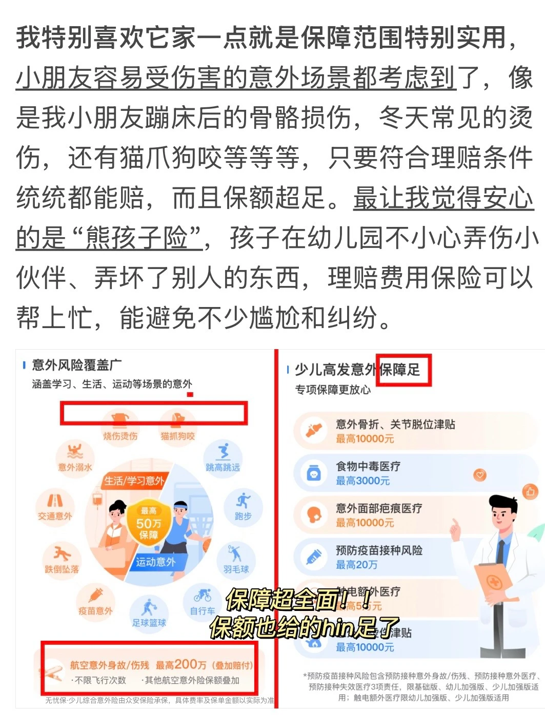 它的保障范围特别广特别实用,小朋友容易受伤害的意外场景都考虑到了,像是我小朋友蹦床后的骨骼损伤,冬天常见的烫伤,还有猫爪狗咬等等等,只要符合理赔条件统统都能赔,而且保额超足。最让我觉得安心的是“熊孩子险”,孩子在幼儿园不小心弄伤小伙伴、弄坏了别人的东西,理赔费用保险可以帮上忙,能避免不少尴尬和纠纷。