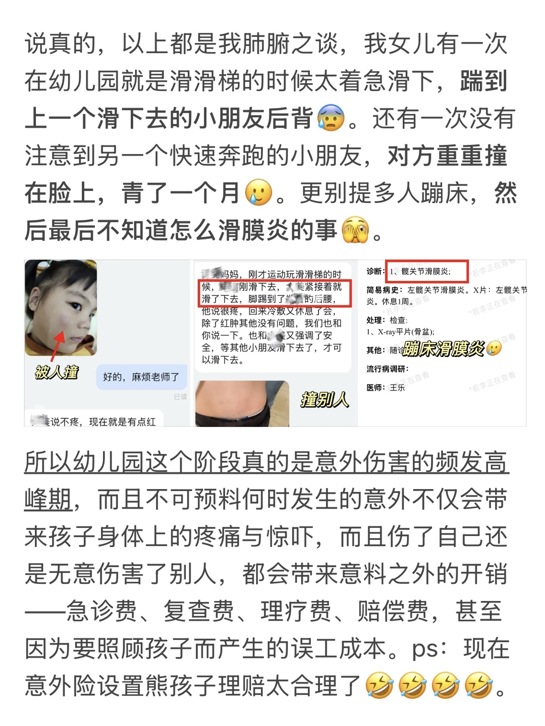 说真的,我娃上了幼儿园后,那真的意外频发,不是撞了别人就是被别人撞,更是滑膜炎了好几次,在家休息了一个月。这些不可预料何时发生的意外不仅给娃带来身体上的疼痛与惊吓,而且增加了意料之外的开销——急诊费、复查费、理疗费、赔偿费,甚至因为要照顾孩子而产生的误工成本。