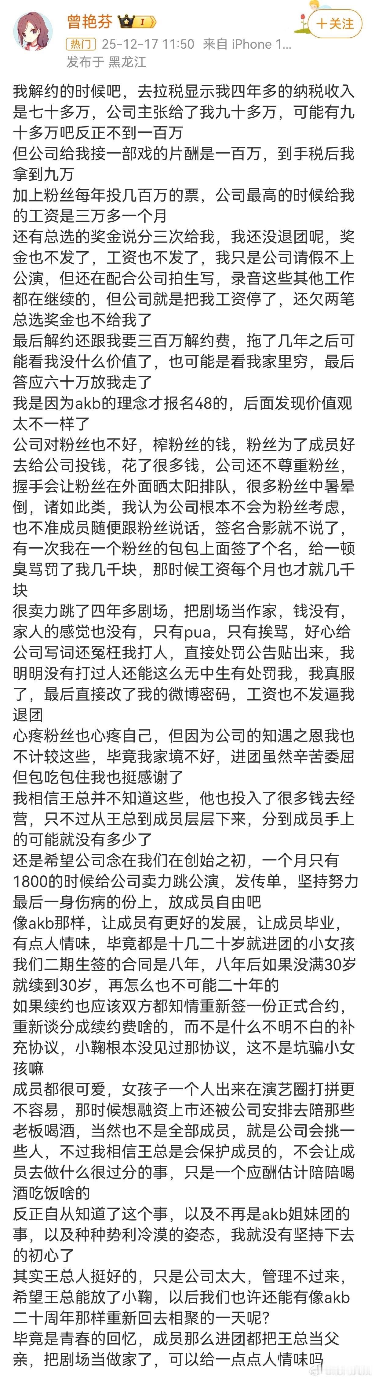 曾艳芬称丝芭坑骗鞠婧祎曾艳芬称丝芭曾让艺人陪酒 17日,SNH48前成员发文回顾自己在丝芭时的待遇收入,称公司给她接一部戏的片酬是一百万,但到手税后她拿到九万,粉丝每年投几百万的票,而丝芭最高的时候给她工资是三万多一个月。解约的时候还想跟她要三百万的解约费,“拖了几年之后可能看我没什么价值了,也可能是看我家里穷,最后答应六十万放我走了。”曾艳芬与同为SNH48二期生,她称“如果续约也应该双方都知情重新签一份正式合约,重新谈分成续约费啥的,而不是什么不明不白的补充协议,小鞠根本没见过那协议,这不是坑骗小女孩嘛。”她还透露公司曾安排挑选一些成员去陪老板喝酒,“我相信王总是会保护成员的,不会让成员去做什么很过分的事,只是一个应酬估计陪陪喝酒吃饭啥的。”