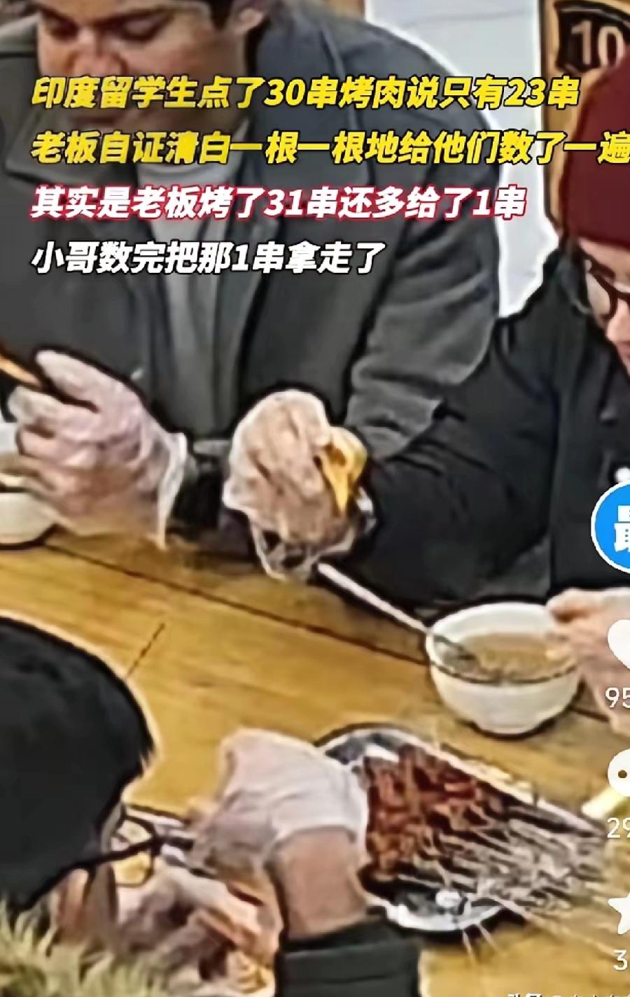 四个印度留学生来店里吃饭这个事,属实把我看笑了,点了30串烤肉、三个馕,还熟练地要了4碗免费高汤,一看就是在西安待了有阵子 结果菜刚上齐,留学生就找过来了,一脸认真地说老板少给了,他们数着只有23串。老板心里那叫一个纳闷,因为店里有个老规矩,怕数错让顾客不满意,每次都会多烤一串,30串实际会烤31串,怎么可能少呢? 为了自证清白,老板直接拿着手机拍视频,当着四个留学生的面,一根签子一根签子慢慢数,数到最后正好31串,不仅没少,还多送了一串。更绝的是,老板数完二话不说,把多的那一串直接拿走了。 后来老板还调侃,这几位连签子都数不明白,怎么教别人呢?也在反省自己是不是格局小了,不该拿走那一串。 网友们倒是支持老板:说,没找事就送,找茬就拿走,没毛病! 我就想说,按理说1、2、3的计数规则该是全球通用吧,又是怎么数错的呢?