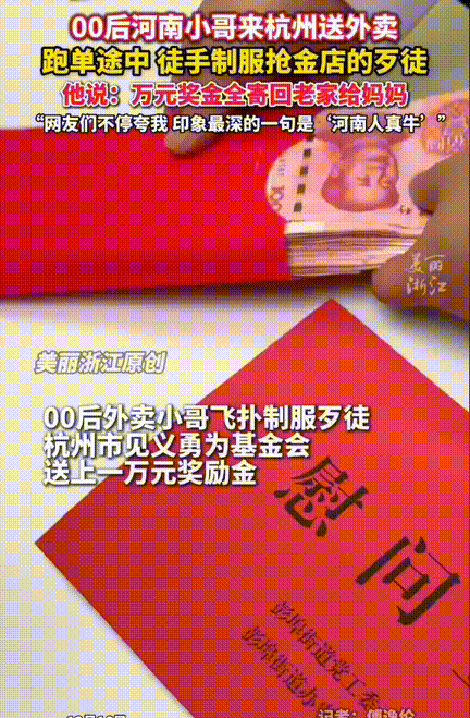 有事是真上啊!河南小哥来杭州送外卖,正坐扶梯往下走呢,突然听见“抢劫啦!”,小哥原本还怀疑这年头还能有人在商场抢劫,结果下一秒就看到几个女柜员追了出来。 正在下行的外卖员立马逆着扶梯往上跑,飞奔上去将抢劫犯死死的按在地上。 被制服的抢劫犯怒斥着:“抓到我对你有什么好处!!” 小哥严肃的回复:“是啊,没好处!” 随后赶来的保安一同将抢劫犯压制。 最后小哥被授予见义勇为积极分子并奖励1万元。 河南外卖小哥的这一扑,扑出了普通人的正义与担当。在这个讲究“多一事不如少一事”的时代,他用行动证明:总有人愿意为了陌生人,伸出援手。 这份勇气,无关职业,无关身份,只关乎内心的善良与正直。 为每一位见义勇为的市民点赞! 外卖小哥