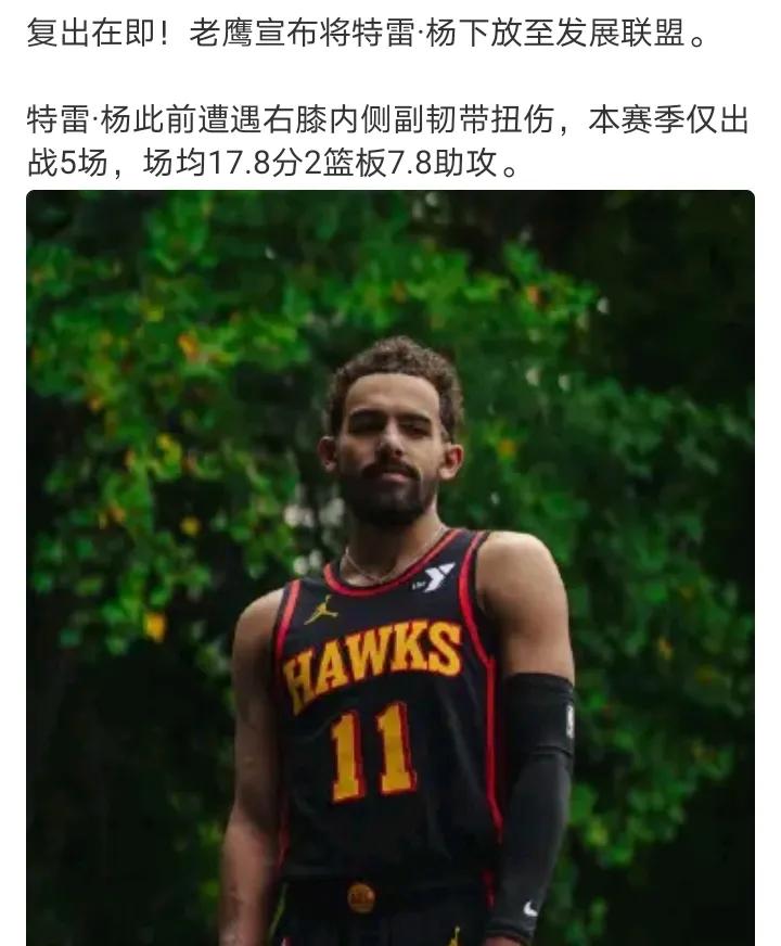 联盟新老更替如此迅猛 小心为妙,不加把劲,很快就被替掉了 老鹰宣布将特雷·杨下放至发展联盟,在约翰逊逐渐打出不错的表现后,特雷-杨位置不保,新一代鹰王啊,前几年老鹰非卖品是他和约翰逊,现在估计非卖品只有约翰逊了。再不复出加把劲,特雷杨极可能成为球队交易的牺牲品。