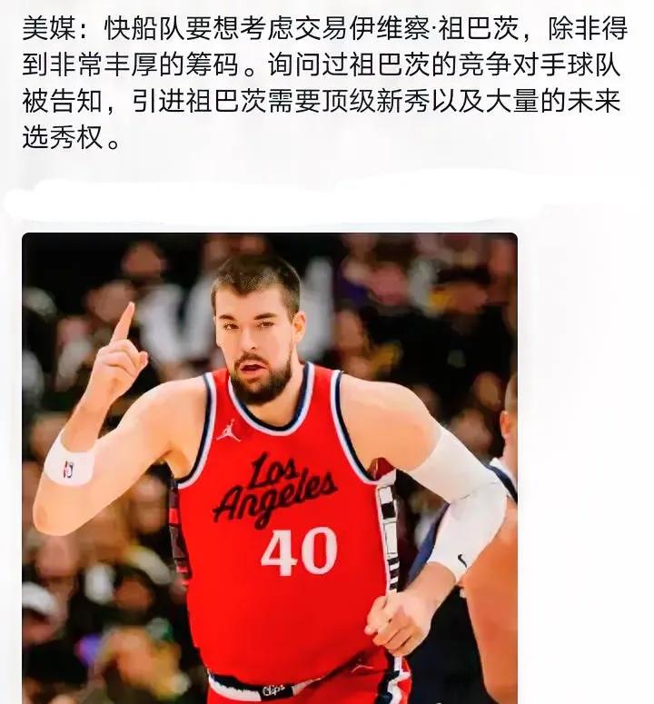祖巴茨不值这些 但是快船敢卖这些肯定有人买 合同,稀缺中锋。在快船现有条件下打的并不差。只是感官上不如上赛季,因为上赛季都是赢球。要一个有潜力的新秀+2个首轮肯定是值的啊,他这赛季打的一般,但数据只比上赛季略有下滑,赛季平均表现还凑活,再加上他具备大多数中锋不具备的好体格,觉得快船如果真要卖,肯定有球队会给。