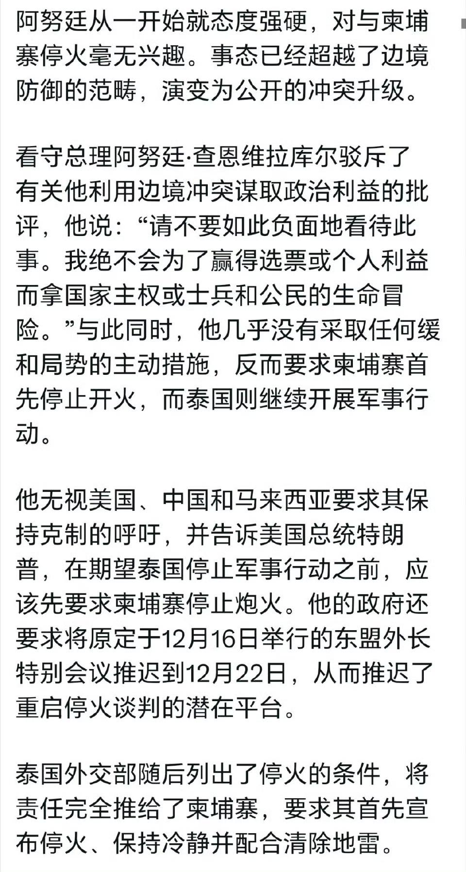 泰国总理阿努廷从一开始就态度强硬,对与柬埔寨停火毫无兴趣。事态已经超越了边境防御