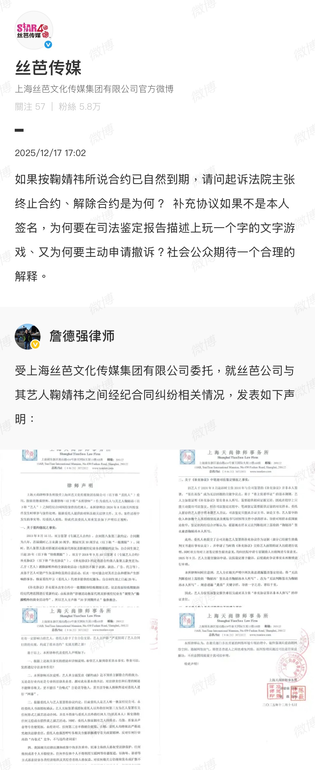 丝芭也是和鞠婧祎撕破脸了!丝芭传媒律师声明鞠婧祎丝芭 20年合约