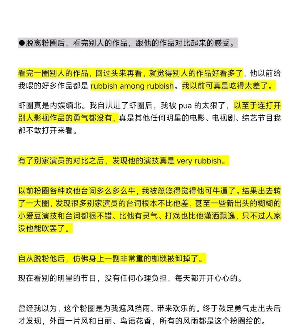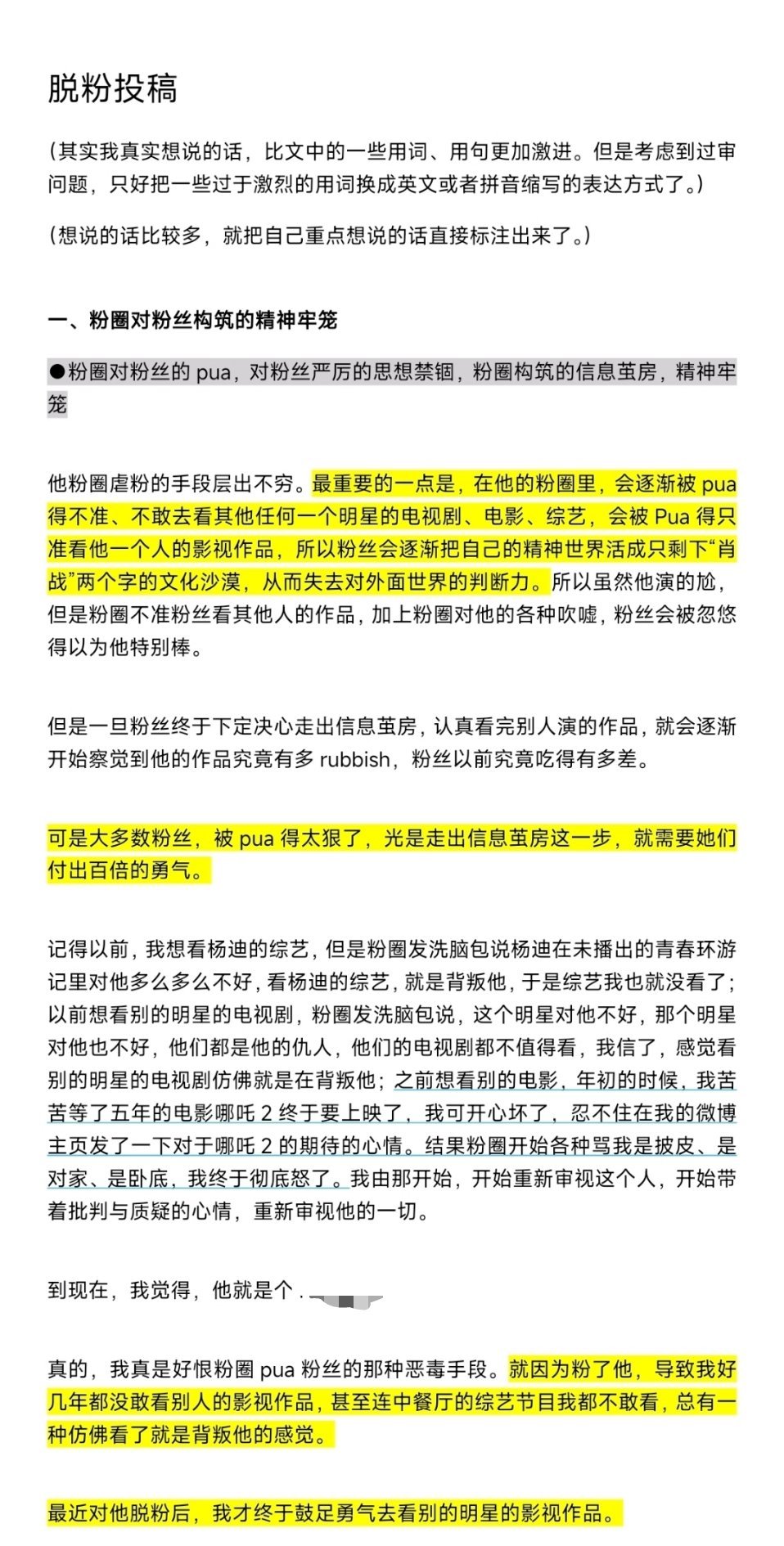 投稿。脱粉心路历程(一)关于粉圈精神牢笼。好像不止一位前粉丝因为喜欢哪吒2而被粉圈攻击怒而脱粉了。希望这位前粉丝走出来,看看其他人的作品,多对比就知道差距在哪里了。