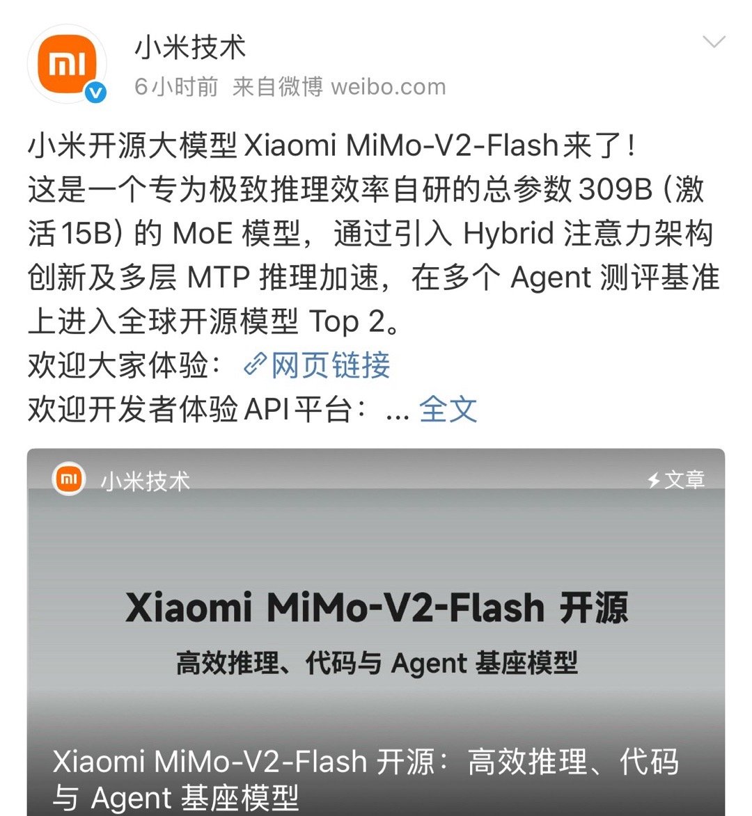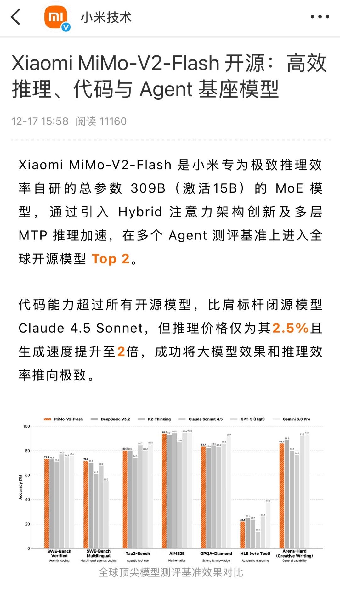 刚刚发布的这个 MiMo-V2-Flash,直接把大模型的效果和效率推到了极致!代码能力直接干翻所有开源模型,甚至比肩那个闭源标杆 Claude 4.5 Sonnet!关键是啥?推理价格只有人家的 2.5%,速度还能快 2 倍!这就是小米,依旧真金白银,不玩虚的,真诚第一!最让我感动的是,权重和代码全部开源!MIT 协议!花了那么多钱那么多精力的东西,你就免费开源了?伟大的公司!黑子们咋个黑啊?这可是实打实的全球 Top 2 水平!不仅仅是在国内卷,这是直接在国际舞台上秀肌肉!无敌!