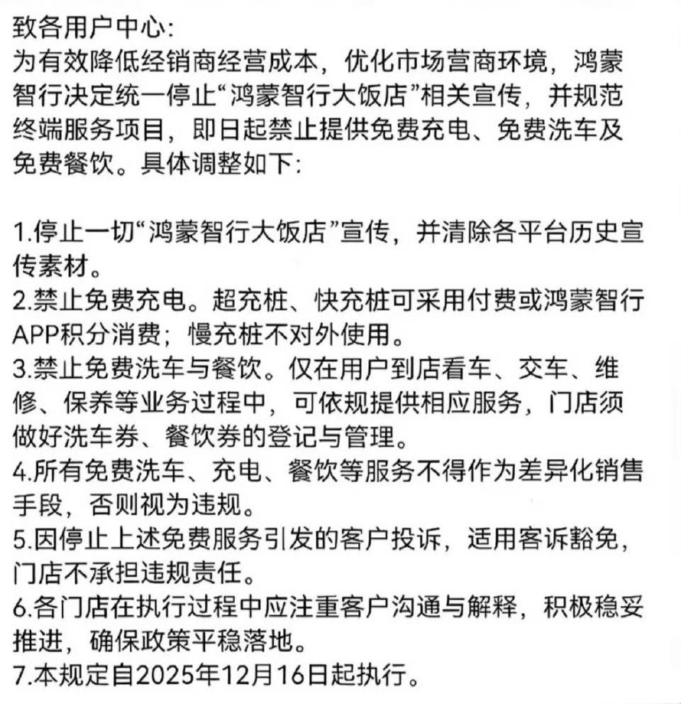 鸿蒙大酒店彻底成为历史,不再免费让车主薅羊毛! 最主要的是有很多人并不是车主也过来薅羊毛,或者说有些车主除了自己吃饭,还带一群人过来挤占了正常的服务。 免费充电服务也确实不应该提供,如果非维修和保养的话,完全可以让这些人在外面自行充电,不然在这些服务中心附近的人会天天去薅这个羊毛。 开始的时候鸿蒙智行的这套宣传还挺好的,时间长了,有些顾客本着来都来了,有便宜不占白不占的原则,确实给经营带来了很多困扰。 各位是怎么看的?欢迎评论区留言。