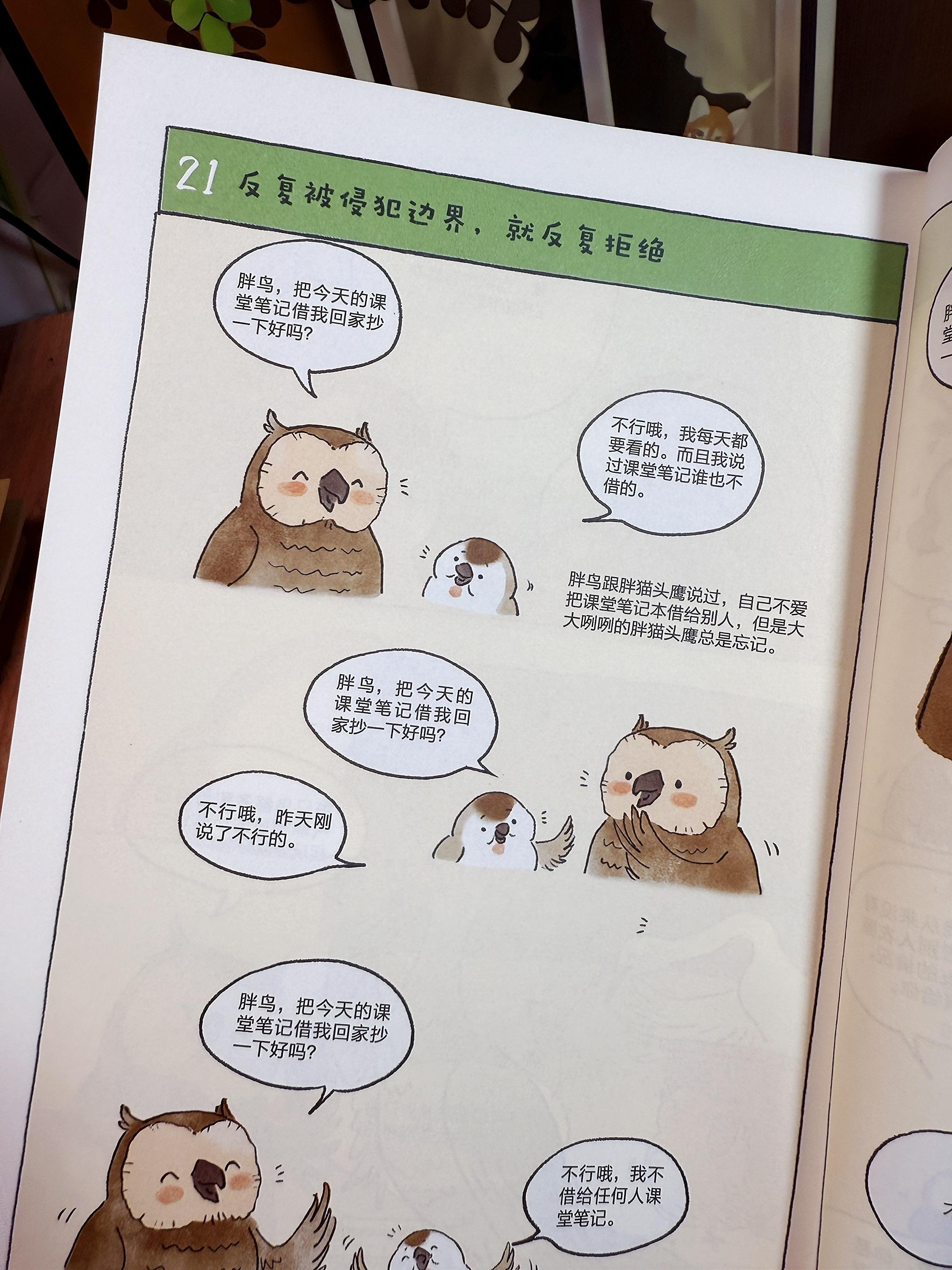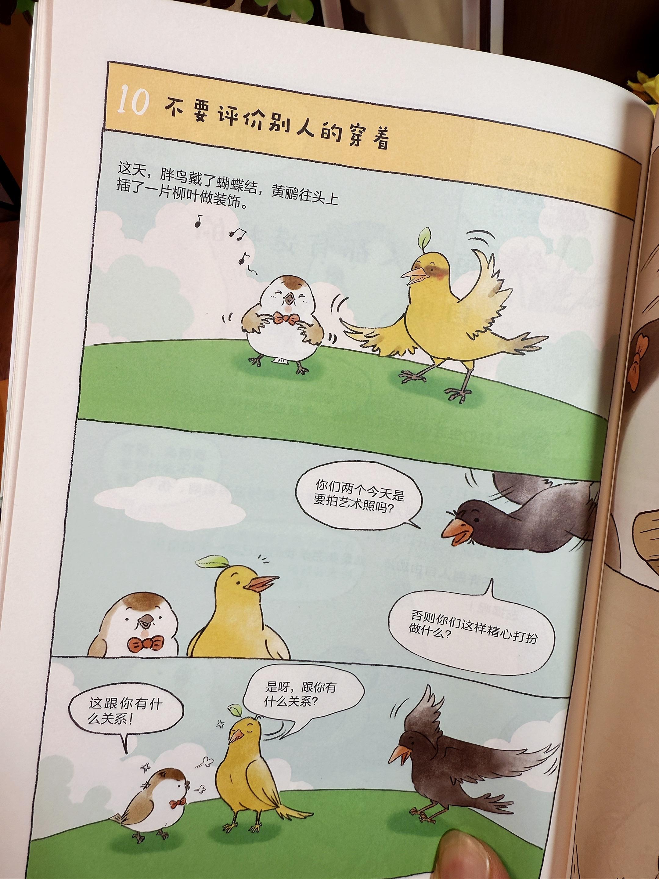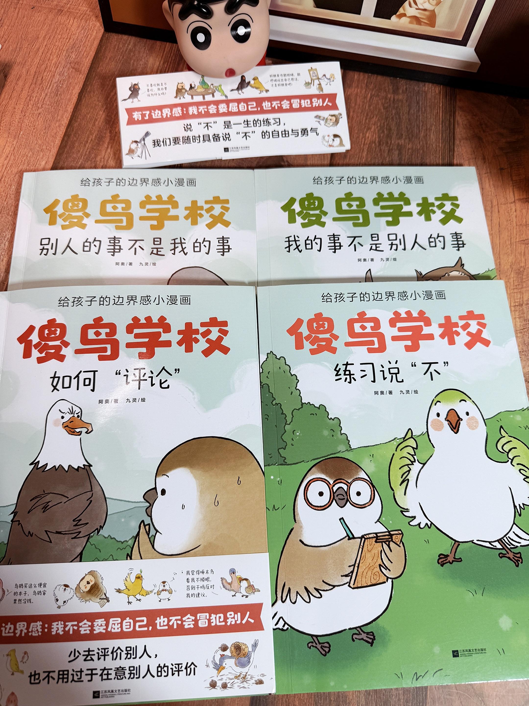 家人们!挖到一套给孩子讲“边界感”的宝藏漫画书!我一个大人看完都想给娃按头安利! 这套《傻鸟学校》一共4本,用萌萌的小鸟故事把 “怎么拒绝”“不随意评论别人”“分清自己和别人的事”这些大道理,讲成了孩子能看懂的小日常~孩子学会说“不”,不用再当“小包子” 知道“别人的事不是我的事”,不瞎掺和也不被绑 架 懂了“我的事我做主”,不委屈自己也不冒犯别人关键是画风软萌,每页都是小漫画,娃翻着翻着就 把 “边界感”刻进骨子里了,老母亲再也不用吼着教 “别老管别人闲事”“要学会拒绝”!