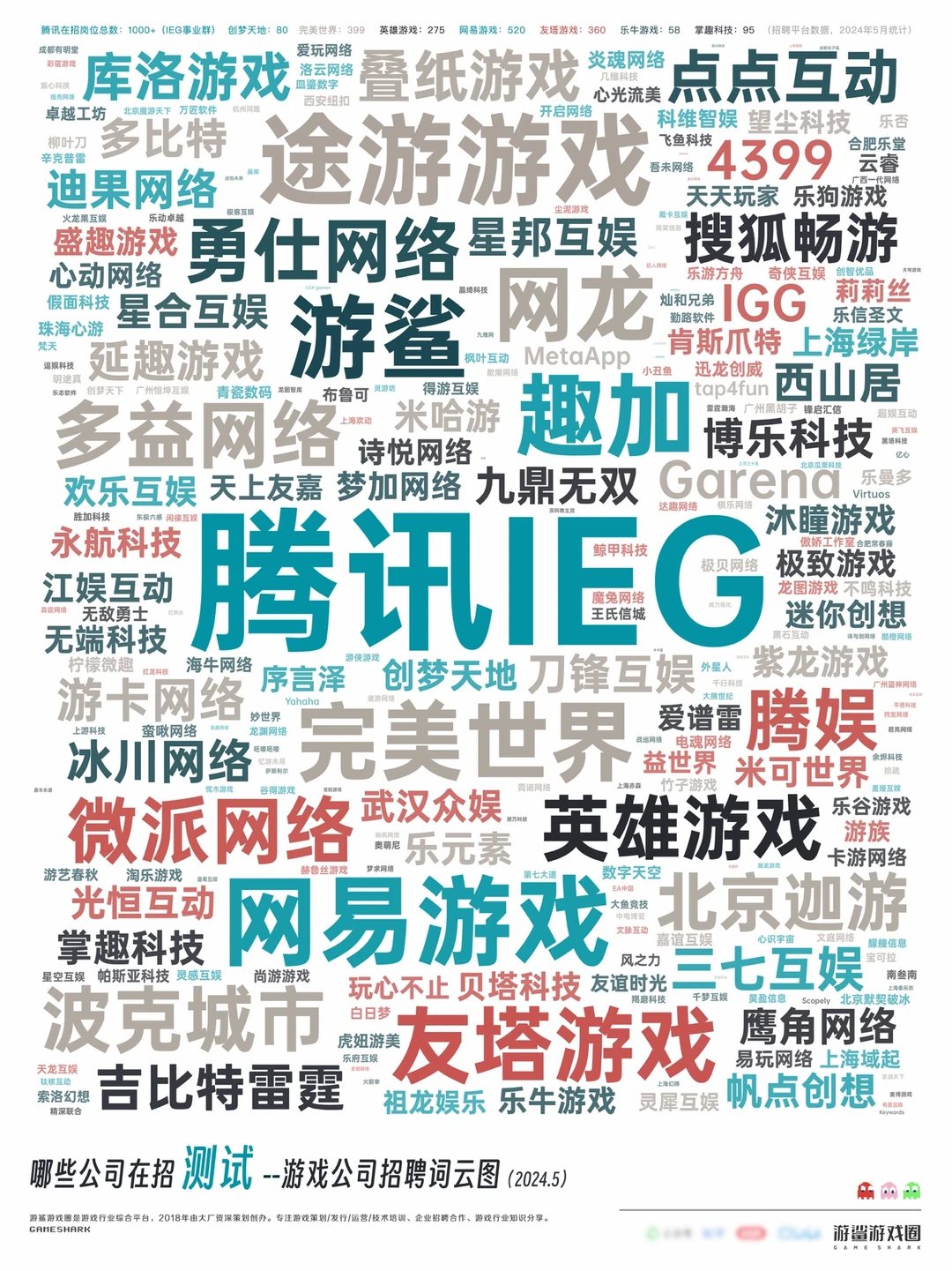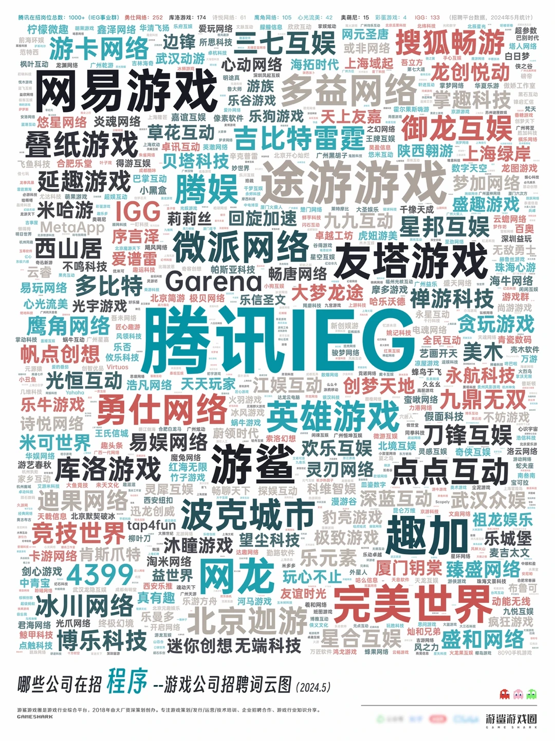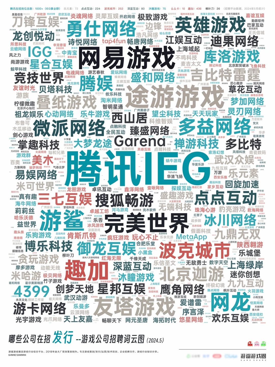 根据各公司招聘职位数制作的词云图,岗位越多,公司越大。 详细公司信息、在招岗位搜索:见【游鲨游戏行业资料共享文档】 在线文档地址:关联的群👉👉置顶或群公告 整体游戏行业报告制作中,下月发布。 (数据来自招聘平台;未去除半年内不活跃的岗位;分岗位词云图是按照公司在招职位总数排序;统计日期:2024年5月)