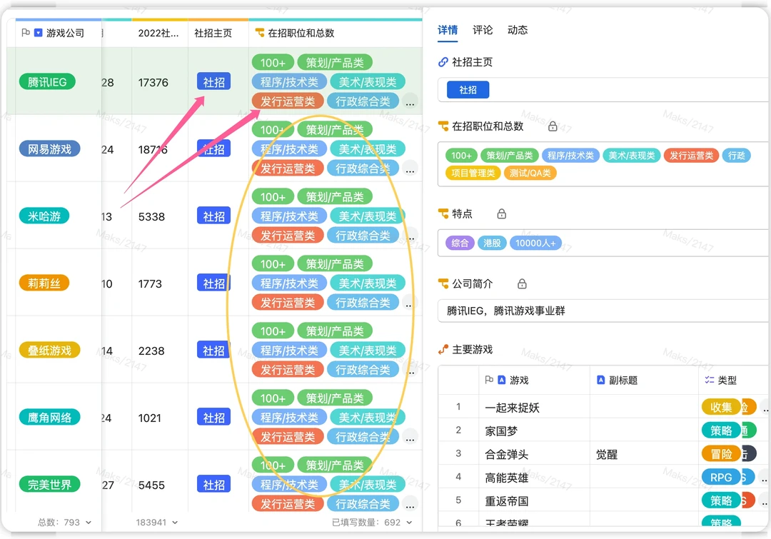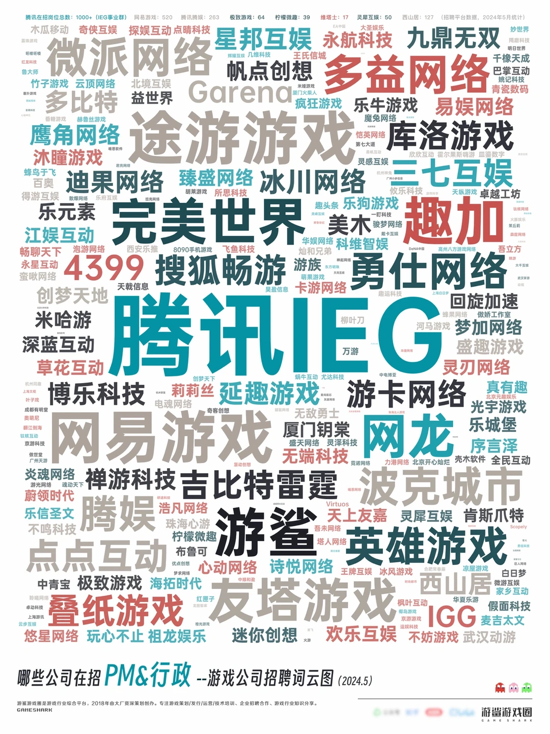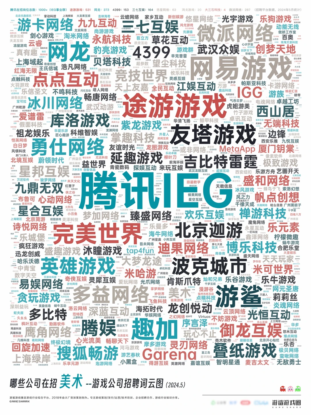 根据各公司招聘职位数制作的词云图,岗位越多,公司越大。 详细公司信息、在招岗位搜索:见【游鲨游戏行业资料共享文档】 在线文档地址:关联的群👉👉置顶或群公告 整体游戏行业报告制作中,下月发布。 (数据来自招聘平台;未去除半年内不活跃的岗位;分岗位词云图是按照公司在招职位总数排序;统计日期:2024年5月)
