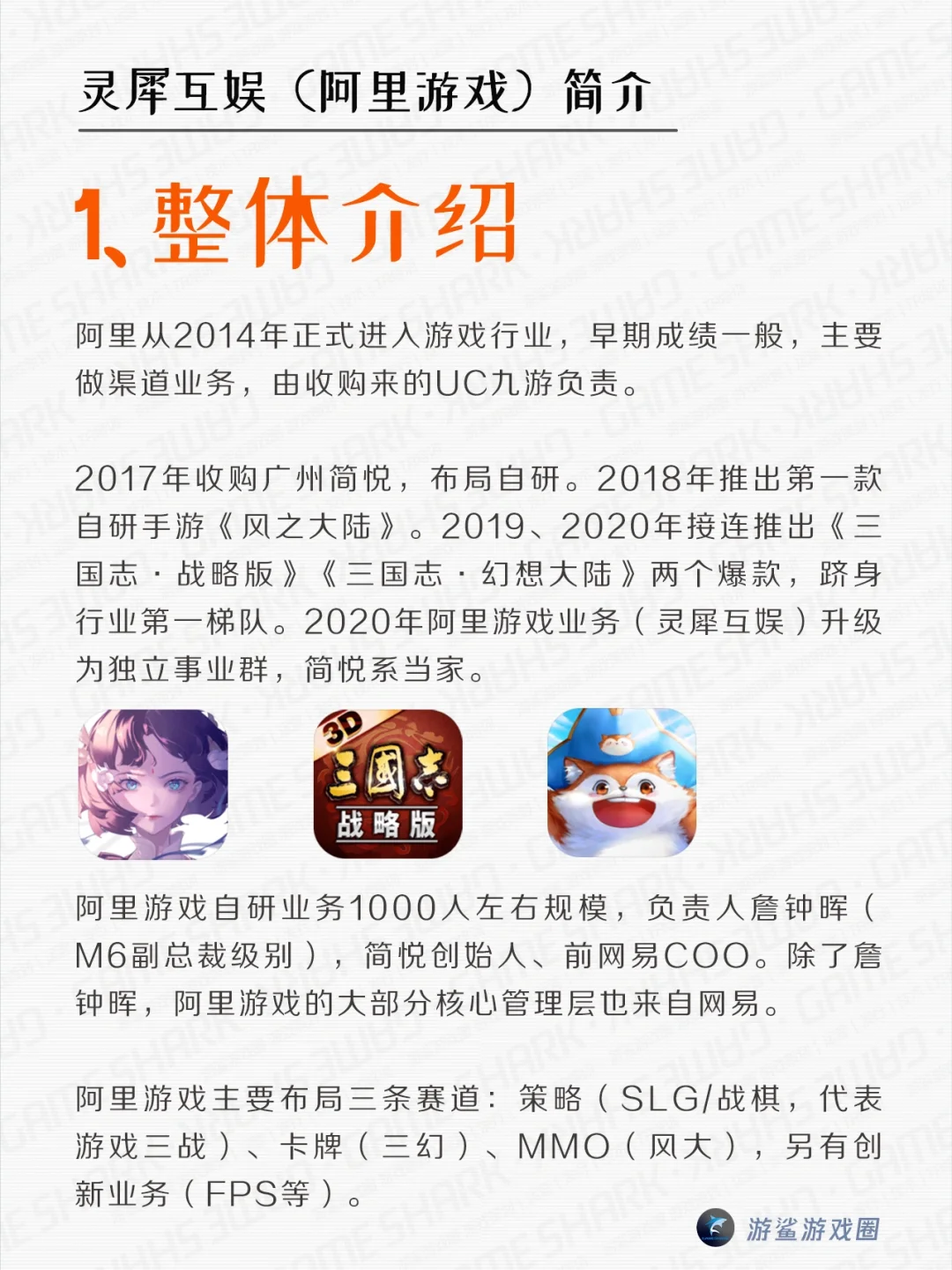 2017年收购广州简悦,布局自研。2018年推出第一款自研手游《风之大陆》。2019、2020年接连推出《三国志·战略版》《三国志·幻想大陆》两个爆款,跻身行业第一梯队。2020年阿里游戏业务(灵犀互娱)升级为独立事业群,简悦系当家。