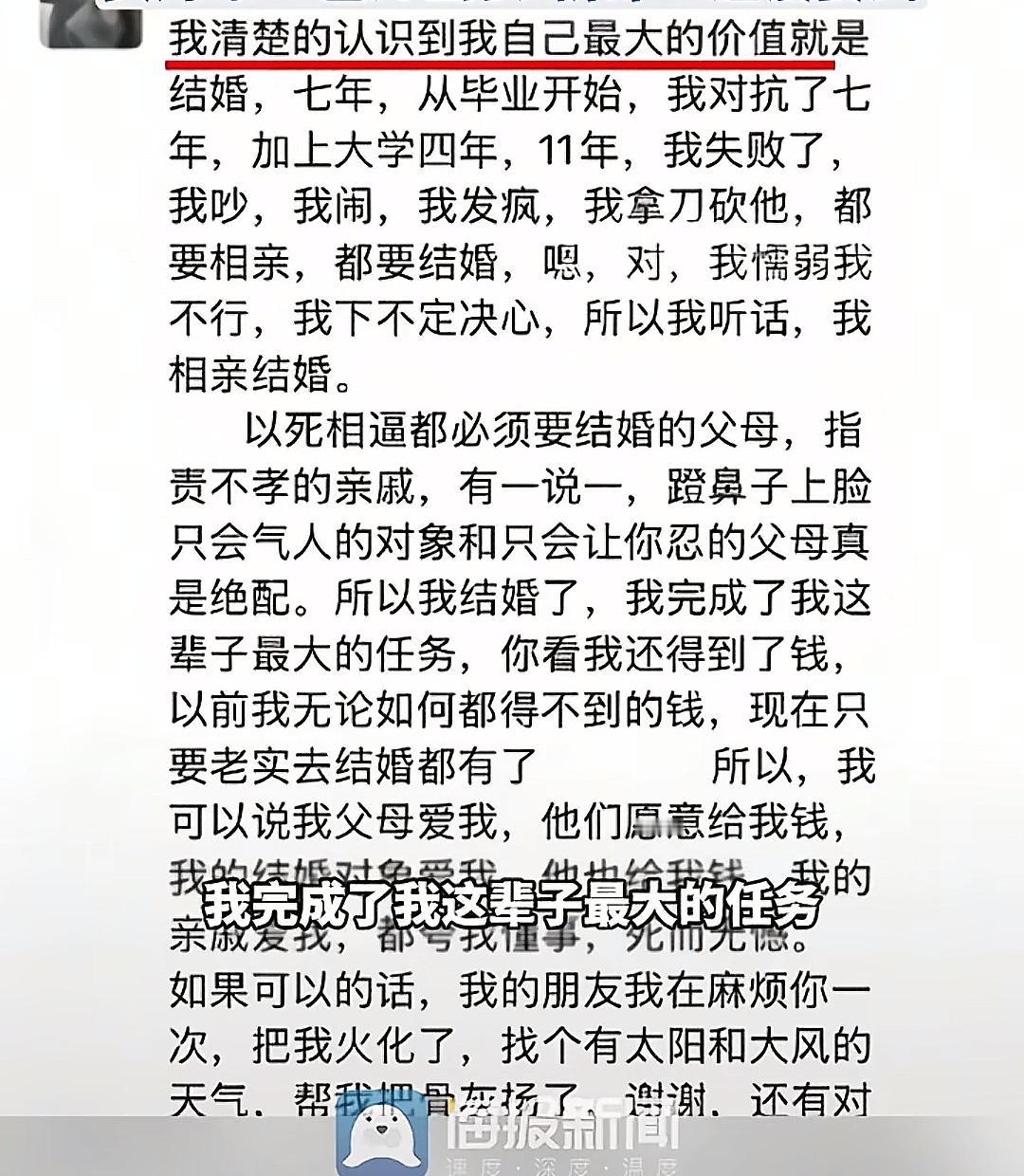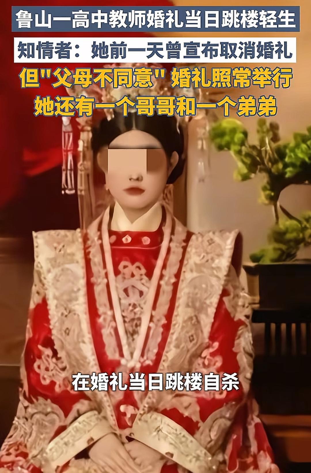 女教师跳楼细节越扒越寒心。父母催婚7年、有哥哥和弟弟、彩礼收下了、婚礼当天穿着黑上衣和牛仔裤……更让人难过的是如今去世了,父母却撇清关系:嫁出去了就不再是娘家人了! 从最开始看见新娘魏某的遗书,就蛮让人难过的,她说:对抗了11年,我终究还是没扛过去!完成了这辈子最大的任务! 甚至连身后事都不愿麻烦父母,只是托朋友在有太阳和大风的日子撒掉自己的骨灰。 或许她在离世的那一刻,才终于意识到父母不爱她吧。 工作7年,她的工资卡一直被母亲牢牢攥着,每月只给500元生活费,省吃俭用才攒下3万元私房钱,而父母收下的27万彩礼,早已被规划成弟弟的结婚准备金。 家里有哥哥和弟弟,她仿佛只是这个家的外来者,最大的用处就是结婚嫁出去。 果不其然,坠楼后她的遗体在冰冷的地面上躺了近24小时,一楼业主担心影响房价要求赔偿,而她的父母和婆家却在互相推诿: 她的亲生父母说人已嫁出去,不算娘家人,而婆家也不服道没走仪式就不算自家人。 傻丫头其实你早该认清现实了,面对这样的父母当初自己攒好钱可以经济独立了,只要给父母养老其他的事情都不归他们管。 不管怎么说,只愿你下辈子可以生活在幸福的家庭。
