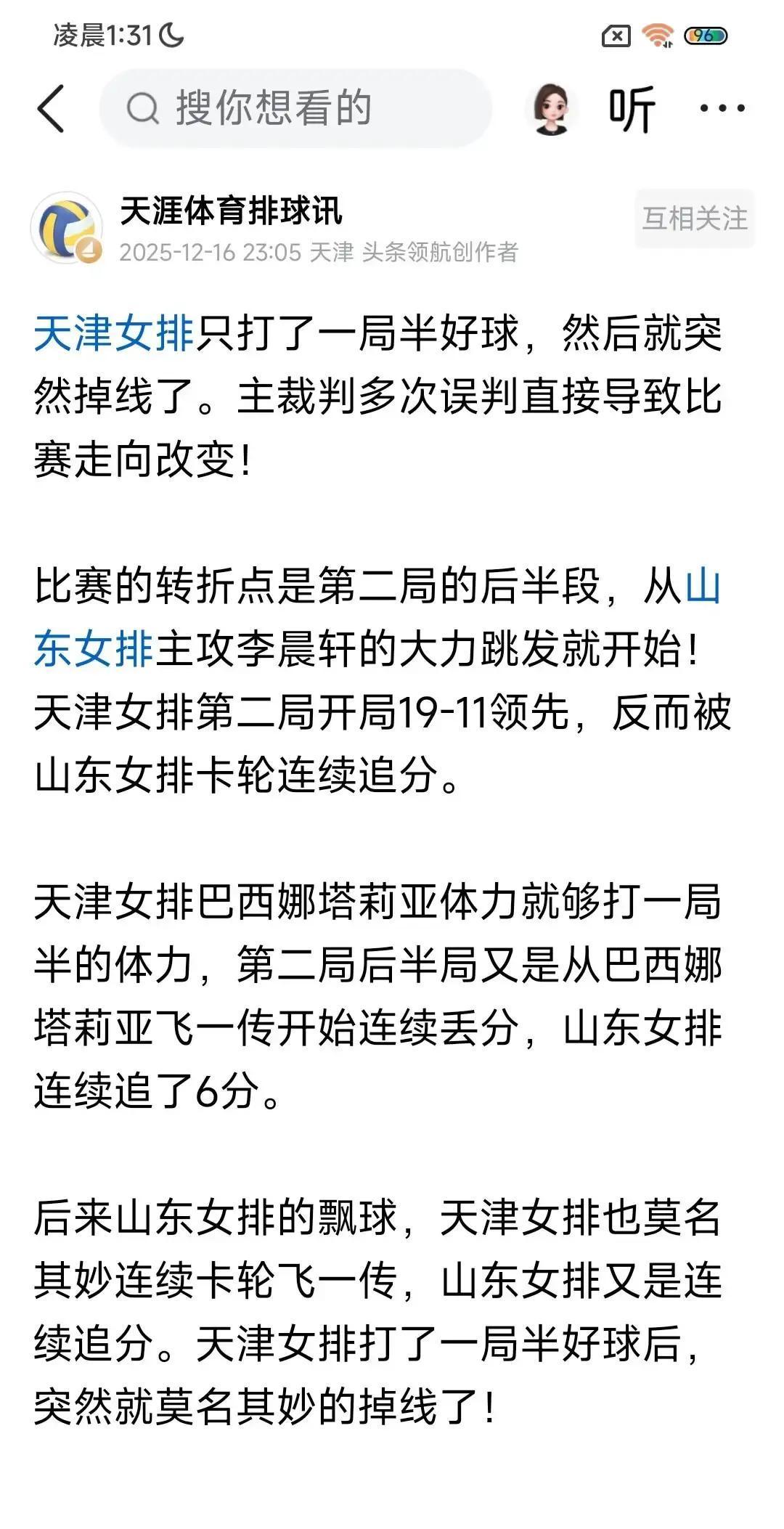 天津女排客场输给了山东队。比分是1比3。 看过球的都知道,问题出在哪。新来的外援跟队里的替补队员,根本就没在一个节奏上。人家瓦尔加斯是有实力,但签证问题来得晚,满打满算才合练两周。这配合能顺吗?场上看着就别扭。 更关键的是,年轻队员交了学费。第一局还能拿下,说明有东西。但打到关键分,经验不足的毛病就全暴露了。机会球抓不住,形势一逆风就不会打了。这学费,交得有点疼。 主教练王宝泉说了,这是必经阶段。这话实在。强队也不能总靠老底子吃饭,新人就得摔打。山东队这场防守拼得好,主场气势也足,赢球是她们应得的。 短期来看,天津队这阵痛躲不过去。外援得尽快融入体系,年轻人得多扛事。但联赛还长,以他们的底蕴和调整能力,没人会小瞧他们。评论员杨昊也说了,队伍底子厚,后期完全可能打回来。现在输,总比关键时刻掉链子强。
