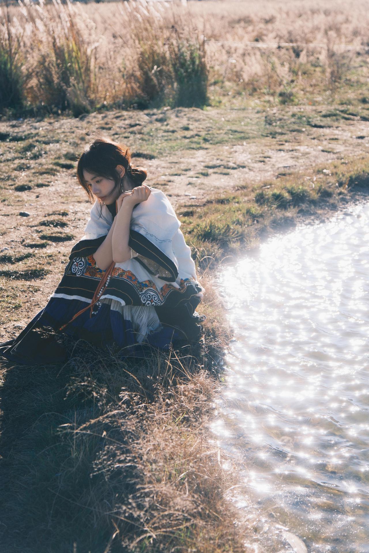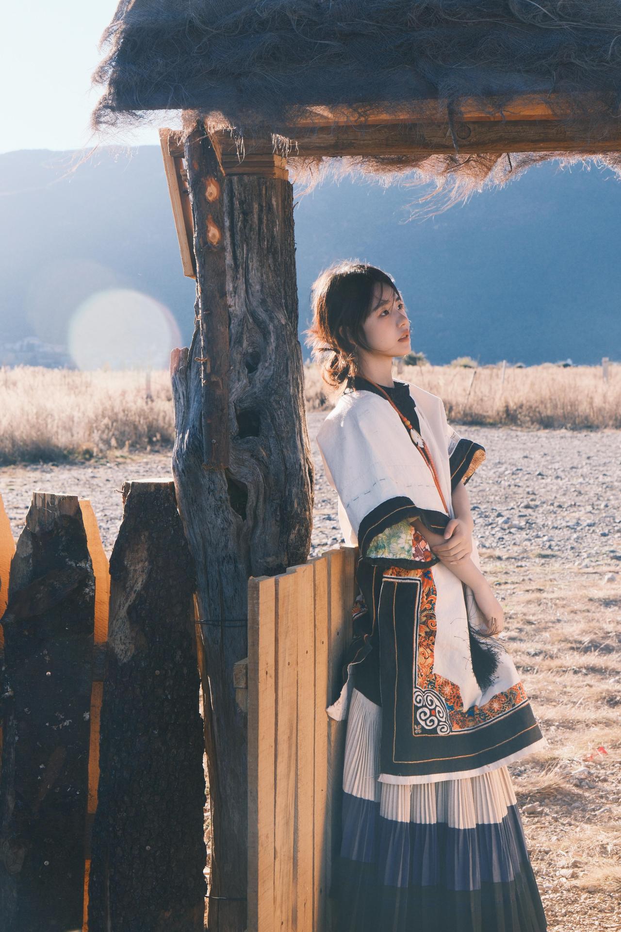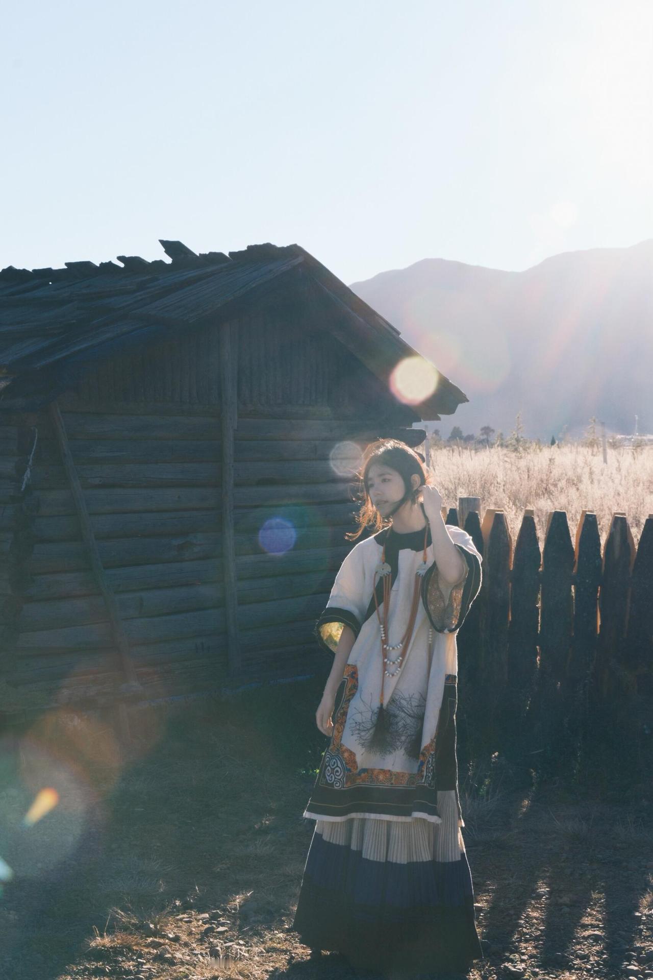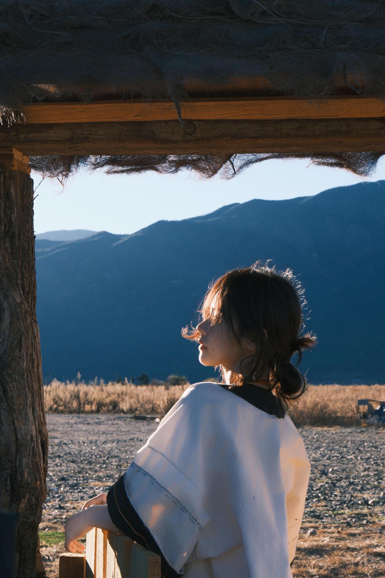 环境人像的魅力,在于用场景和道具撑起画面的叙事性。这次拍摄里,经幡、木亭、湖水都是天然道具,我让模特轻扯经幡,让飘动的彩布和人物的动态形成互动,风扬起的布料不仅增加了画面层次,还让静态的人像多了灵动的氛围感。晒图笔记大赛 在木亭取景时,利用门框做框架构图,把远处的山峦框在背景里,人物侧身站在亭下,明暗对比突出主体的同时,也让环境的纵深感拉满。就连地面的枯草、水边的石子,也能成为点缀——让模特蹲在枯草旁,手部轻触地面,小细节能让人物和环境的联结更紧密,画面也会更有生活气息和故事感。