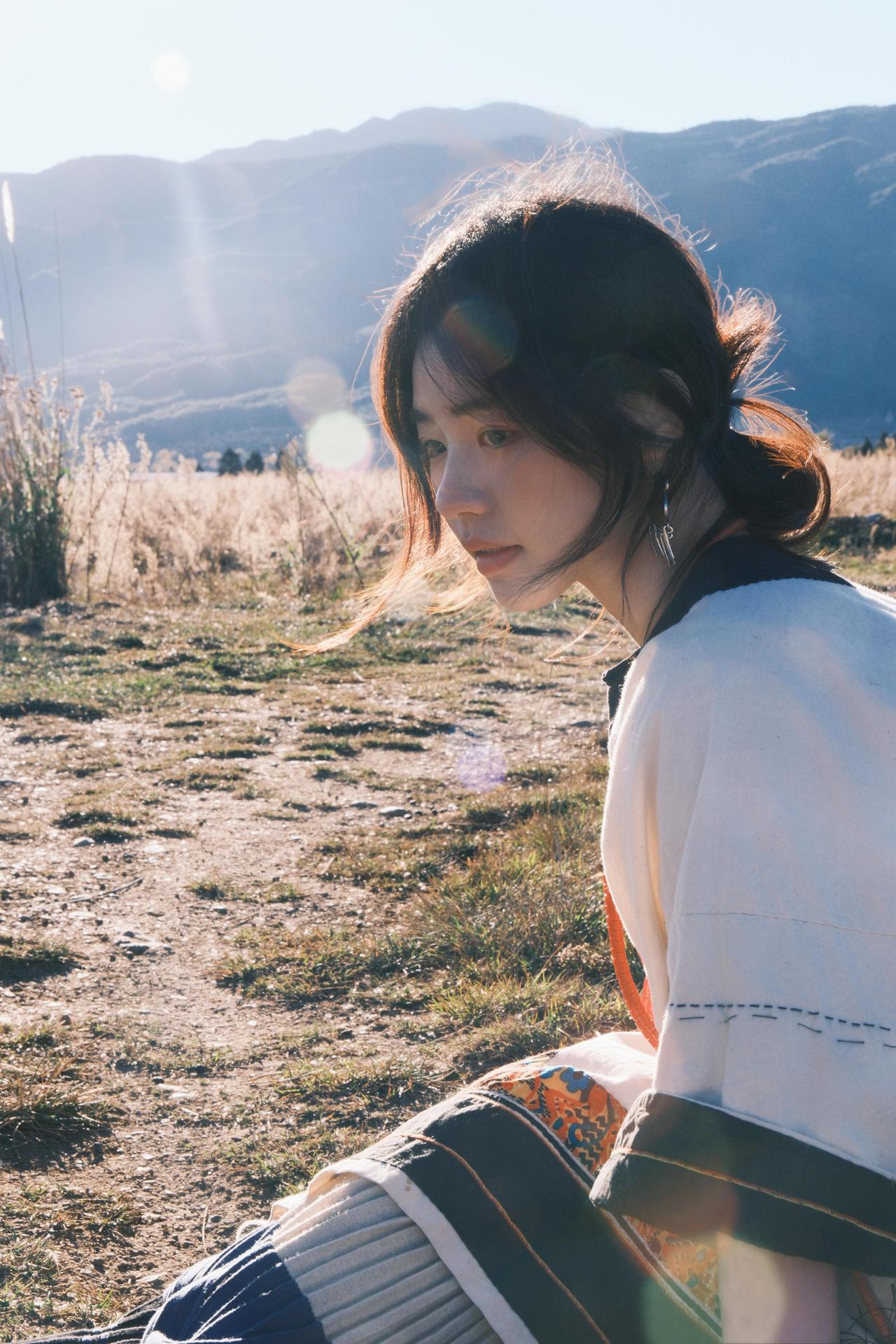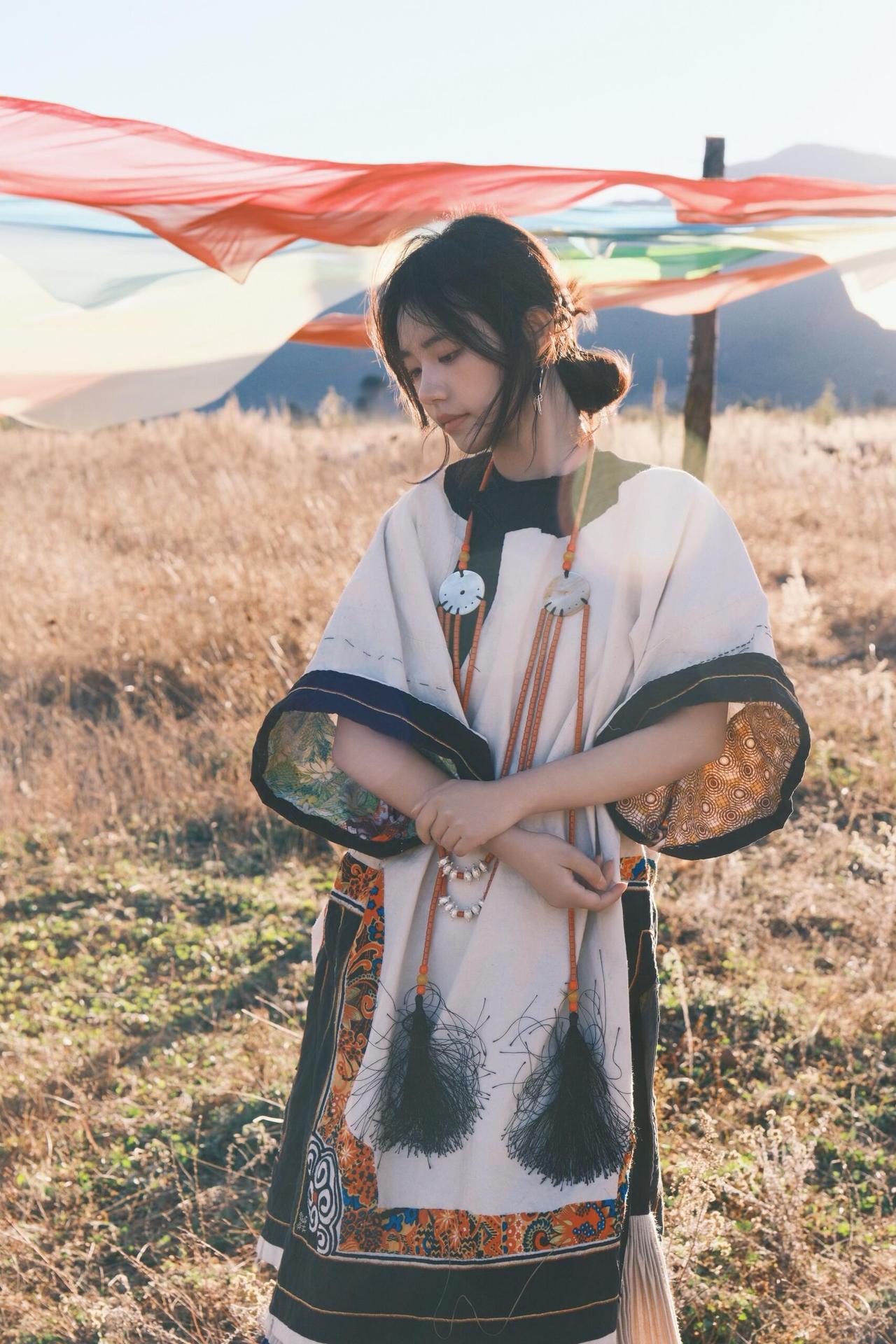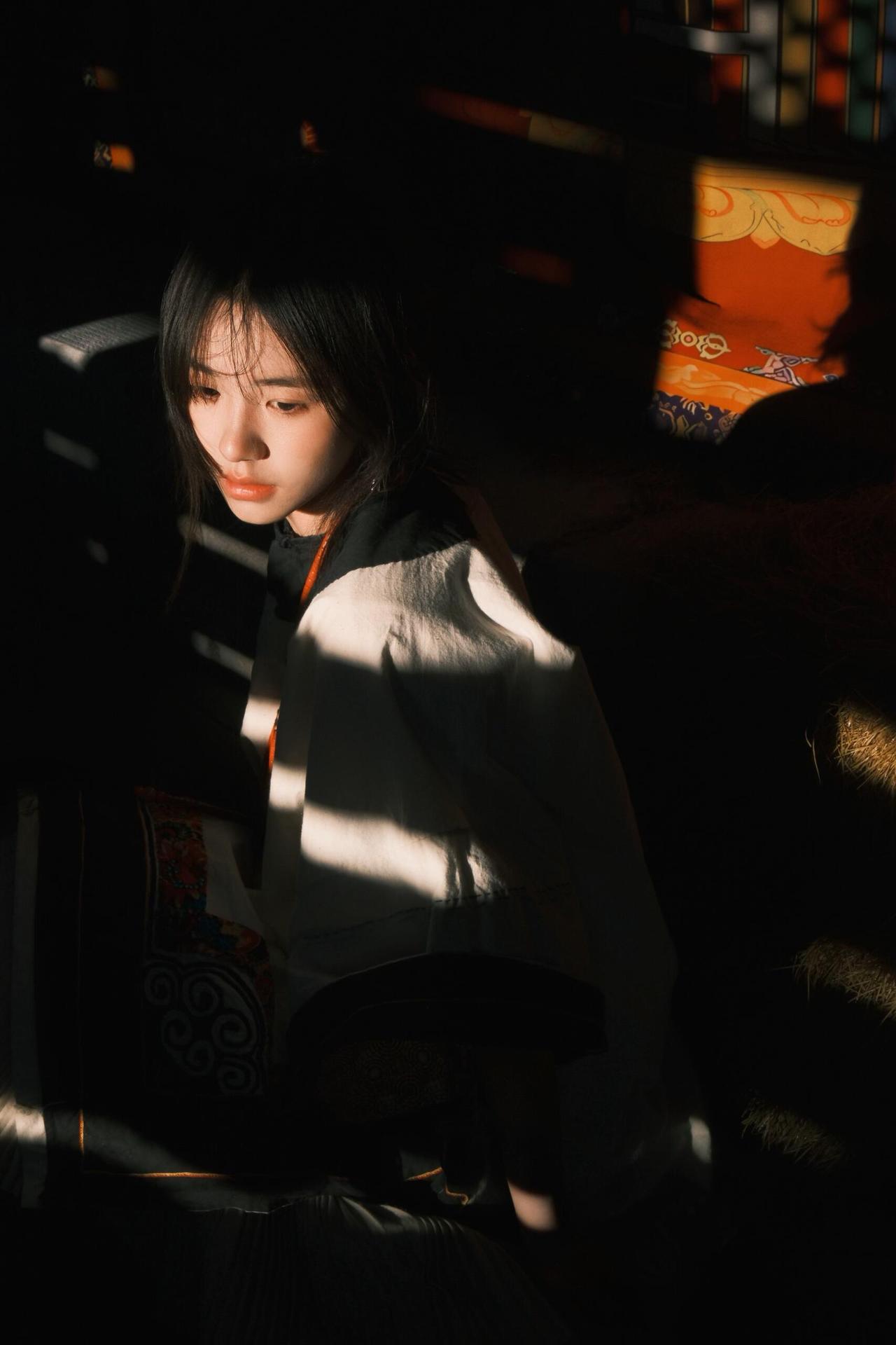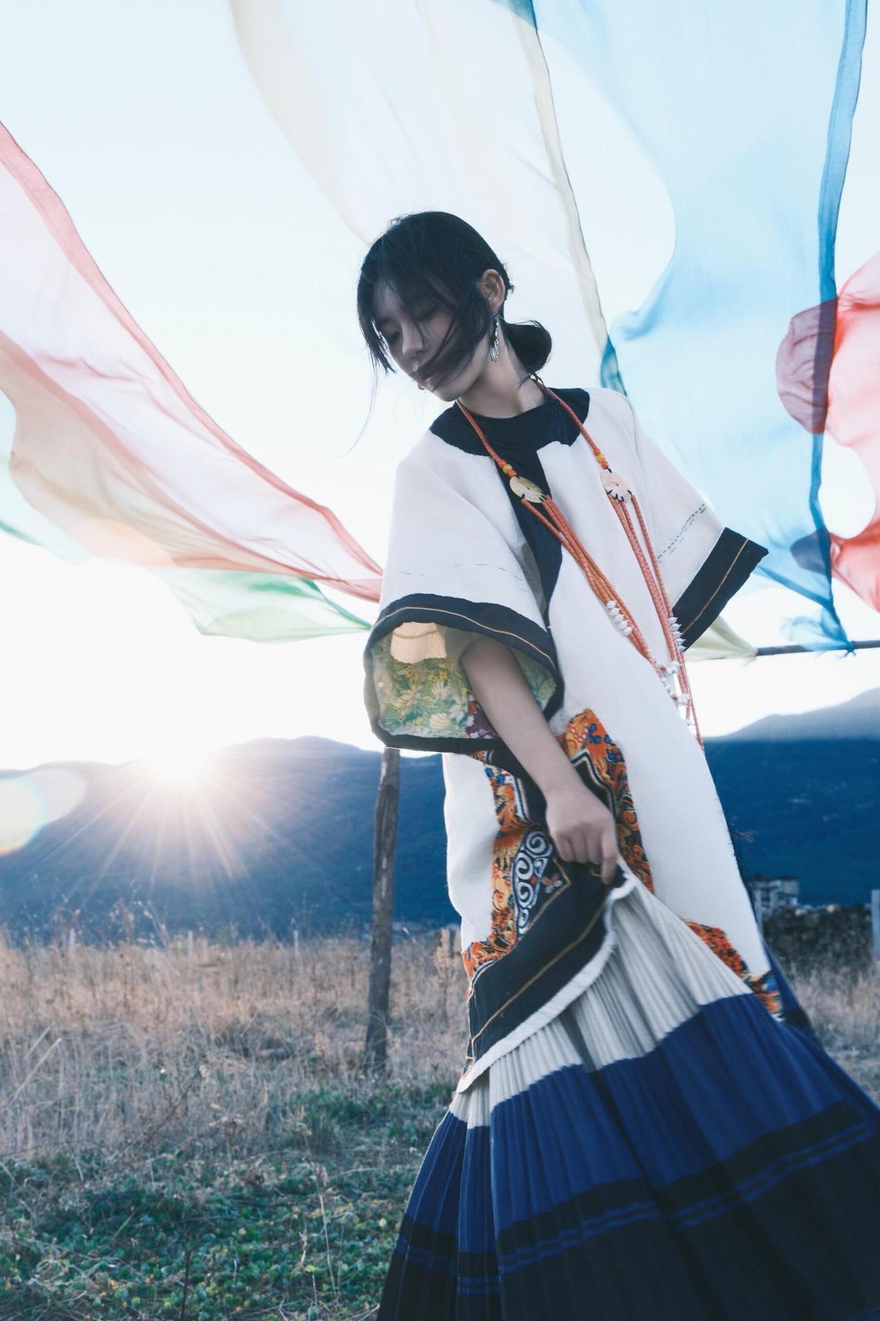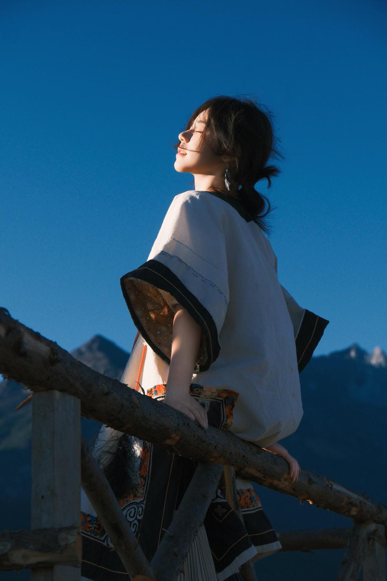 环境人像的魅力,在于用场景和道具撑起画面的叙事性。这次拍摄里,经幡、木亭、湖水都是天然道具,我让模特轻扯经幡,让飘动的彩布和人物的动态形成互动,风扬起的布料不仅增加了画面层次,还让静态的人像多了灵动的氛围感。晒图笔记大赛 在木亭取景时,利用门框做框架构图,把远处的山峦框在背景里,人物侧身站在亭下,明暗对比突出主体的同时,也让环境的纵深感拉满。就连地面的枯草、水边的石子,也能成为点缀——让模特蹲在枯草旁,手部轻触地面,小细节能让人物和环境的联结更紧密,画面也会更有生活气息和故事感。
