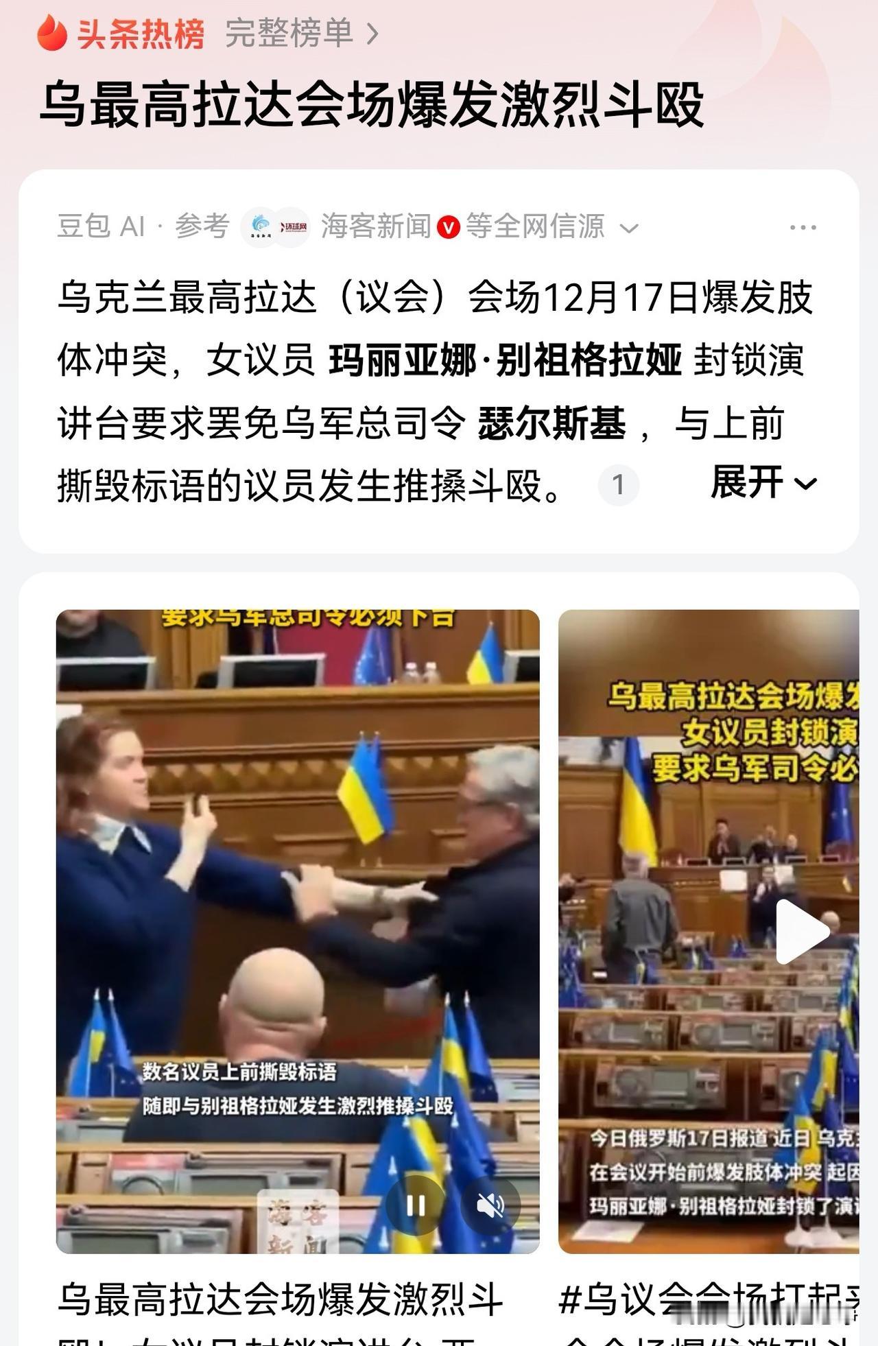 这种程度的冲突真不算激烈,完全不是斯拉夫人的性格。 可能因为对方是女议员吧,所以看那个场面就跟打情骂俏一样。 17号当天乌克兰女议员,玛丽亚娜.别祖格拉娅在乌克兰最高拉达上拉起了条幅。 他要求罢免乌军总司令瑟尔斯基。 要求他为前线大量的伤亡负责。 他的这一行为引起了另一位男议员的不满。 这位银发的男议员冲上去想要撕掉标语。 结果和玛利亚娜发生了推搡。 整个过程都被旁边的议员拍摄了下来。 其实看整场画面大家就明白了,乌克兰的议会现在已经形同虚设。 连人数都凑不齐,稀稀拉拉的就那几个。 他们也不是傻子,他们知道权力真正运转的规律。 枪杆子里面出政权,而不是选票里面出政权。 泽连斯基手里有枪,特朗普控制的美国势力手里也有枪。 人家两边斗起来了。 普京手里同样也有枪。 他们才是有权势的人。 而这些议员们,在战争面前说实话就是个吉祥物罢了。 已经到了演戏都没人看的地步了。 这都是小场面,当年颜色革命的时候乌克兰最高拉达里面天天群殴。 那真是拳拳到肉打的血肉模糊。 今天这场面根本就不够看的。