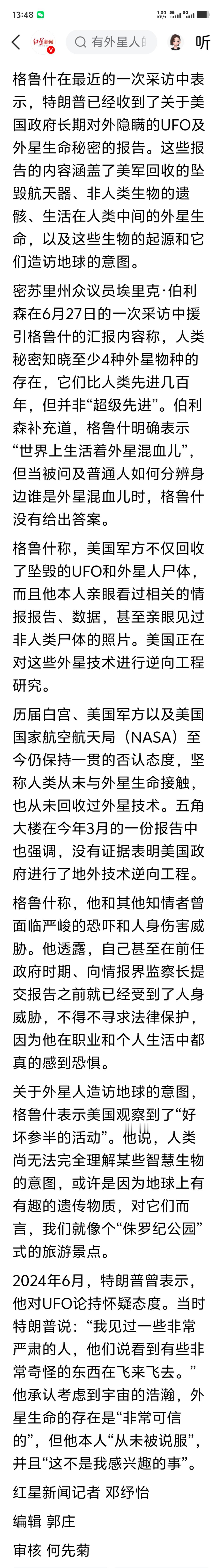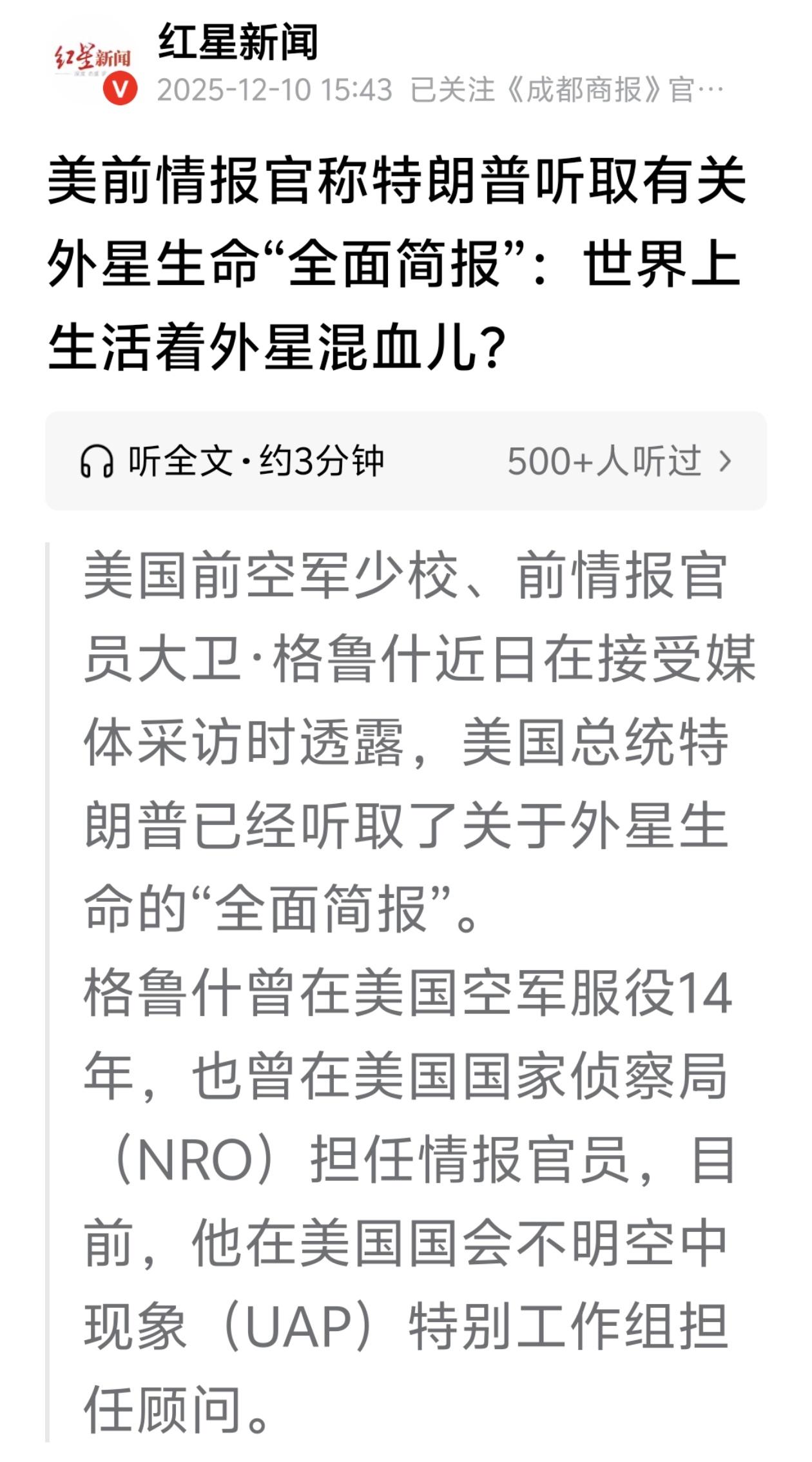 想相信,又不敢相信,美国人说外星人真的要来了! 我从小就喜欢看一些关于外星人的科幻故事,也满心期待有生之年能有幸亲眼看见所谓“第三类接触”真的发生。 但长大以后每次看见类似的报道,理智又告诉我,信他个鬼,骗小孩玩呢? 然而,这次情况好像不太一样。 爆料的这位格鲁什不是什么UFO爱好者、民科,或者前某某机构离职后靠着胡说八道赚热度蹭流量的那些人,他是美国国会的现职官员。 在我浅薄的认知里,现职官员,总不好拿着薪水公开扯犊子吧?何况还牵涉到他们家大总统。 格鲁什担任顾问的这个“美国国会不明空中现象特别工作组”,我查了,确实是正儿八经的美国官方机构。 资料显示这机构是2020年成立的,隶属于美国国防部,也就是现在的战争部,并且在2022年已经升级为“全域异常解决办公室”,调查和科学审查的范围也从“不明空中现象”扩展至所有领域,包括海上的、太空的,或者其他地方的。 感觉好权威的样子。 如果他说的都是真的,那信息量就真的有些令人头皮发麻了。 据他说,他们已经向特朗普作了关于UFO及外星生命秘密的报告,内容涵盖了美军回收的坠毁航天器、非人类生物的遗骸、生活在人类中间的外星生命,并且明确表示世界上还生活着外星混血儿。 你没看错,生活在人类中间的外星生命和外星混血儿! 有没有一些科幻照进现实那味了? 看到这些消息的时候,我都不知道自己是应该兴奋还是应该害怕了。[我想静静] 可是特朗普本人的态度却耐人寻味,人家一方面承认“外星生命的存在是非常可信的”,一方面又说“但是他本人从未被说服”,并且“这不是他感兴趣的事”。 特喵你不感兴趣我们感兴趣好吧!你说个这么莫名其妙地话,还不如不说好吧!这倒是让我们信还是不信啊? 骂过之后,定神仔细想想,这事怎么有些似曾相识的感觉? 前苏联哀怨的残影模模糊糊的飘过眼前。 到底是“真•外星人来了”,还是“美版•战忽局在行动”,或者是“星球大战计划第二季”? 各位怎么看? 要我看,像这种事啊,还是等咱家自己的官方消息吧,现在这个魔幻的世界,好像只剩下咱们一家说话靠谱的了。