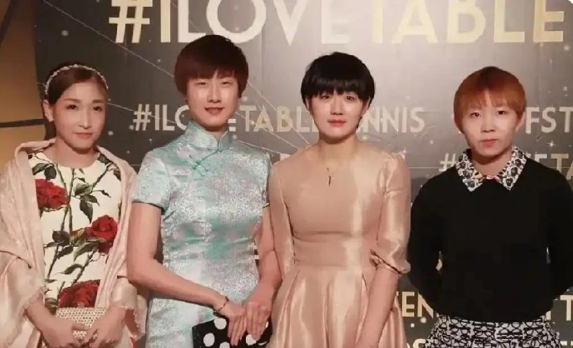 4朵金花私服合照:身着一件修身旗袍的丁宁身材高挑,短发无瑕,目光沉和;左侧的陈梦胖瘦适宜,龙眉凤目,莹洁如玉! 金发覆额的朱雨玲俊目流眄,唇若红玉;穿一袭印有玫瑰花连衣裙的刘诗雯,手执镶钻小包,头戴精美发卡,真是瑰姿艳逸哈!