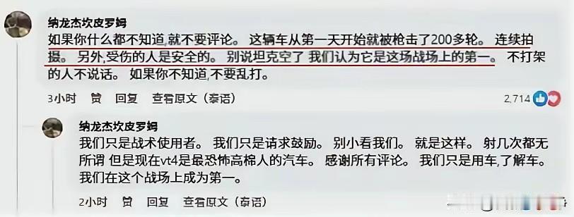 拍照片的这几个人就是那辆炸膛的VT4坦克的驾驶员。 后面他们亲口承认了坦克炮管炸膛是因为他们连续发射了200发炮弹。 而中间没有进行任何的炮管清理保养工作。 大量的火药残渣根本没有得到清洗。 我们要知道VT4坦克是可以充当自行火炮使用的。 但是设计可以充当,却没说过让他们这么用。 毕竟它是坦克,不是纯粹的自行火炮。 炮管的设计跟自行火炮还是有区别的。 咱们的设计师从来没有想过有人会连续发射200发炮弹都不清理炮管。 所以说炸膛也是很正常的事情。 根本不是负面新闻,这是军功章好不好? 大家看看人家泰国互联网上对坦克的评价吧。 人家是实战一方,真正使用的一方,他们的口碑才是真实的性能。