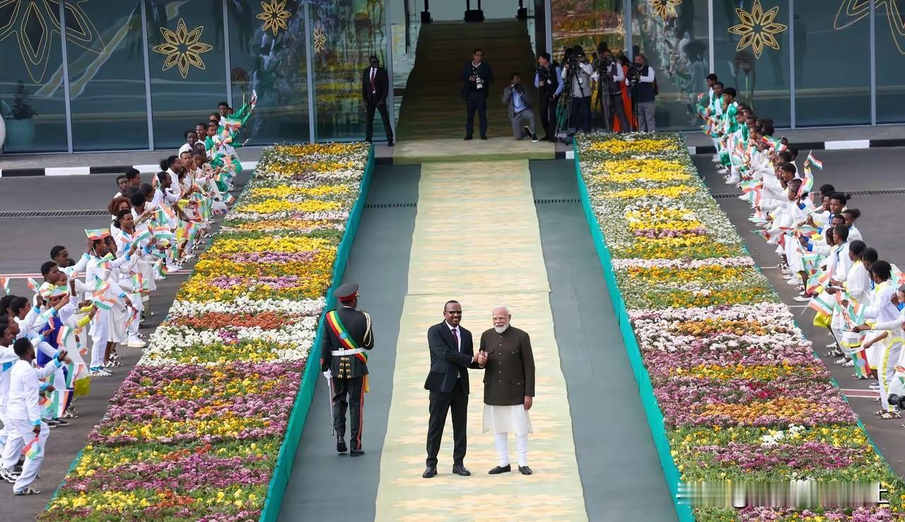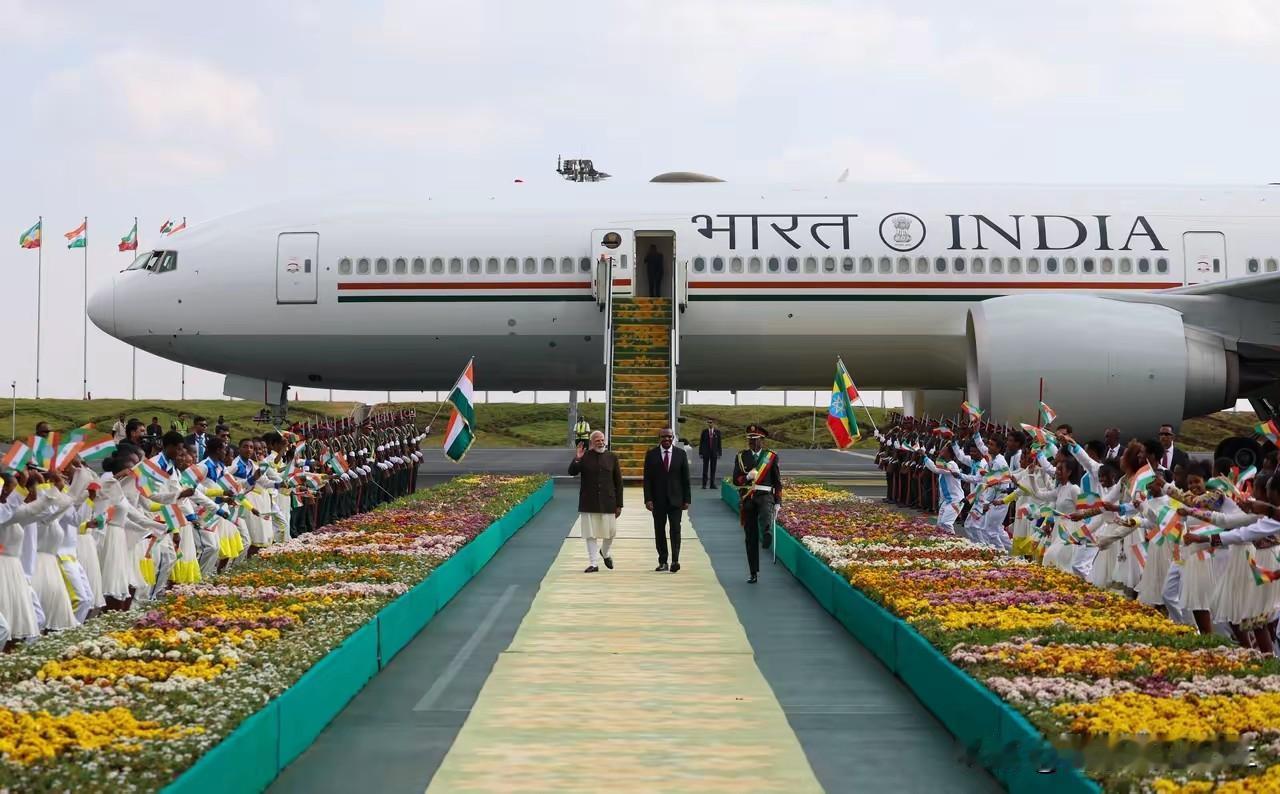 莫迪满足了! 到访埃塞俄比亚,莫迪老仙自己都被震撼到了,这才是印度三哥应该得到的排场! 专机抵达时,埃塞国民族舞蹈团在宽敞的迎宾大道旁载歌载舞,两边的大花坛一直铺到旋梯旁,虽没有红地毯,但规格远胜红地毯!总理阿里亲自到旋梯旁迎接,这可是埃塞最有权力的大人物啊! 超过预期,莫迪本来还在纠结两年前到访约翰内斯堡时,被南非国不待见的场景呢!当时是南非部长级别迎接,也不见红毯,结果莫迪不下飞机,最后拉马福萨总统只好安排副总统赶去机场,莫迪总算走下旋梯!这也是外交史上的经典! 看来埃塞国很聪明,投其所好,满足了讲究排面的莫迪所需,接下来可能印度就会大手笔投资埃塞,彼此作交换,埃塞肯定是赚了! 估计以后非洲兄弟都清楚了,只要莫迪来访,规格应该怎样!