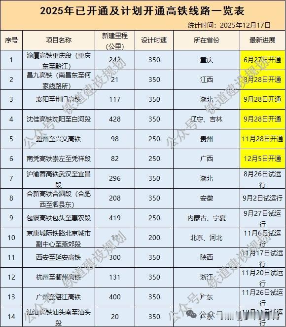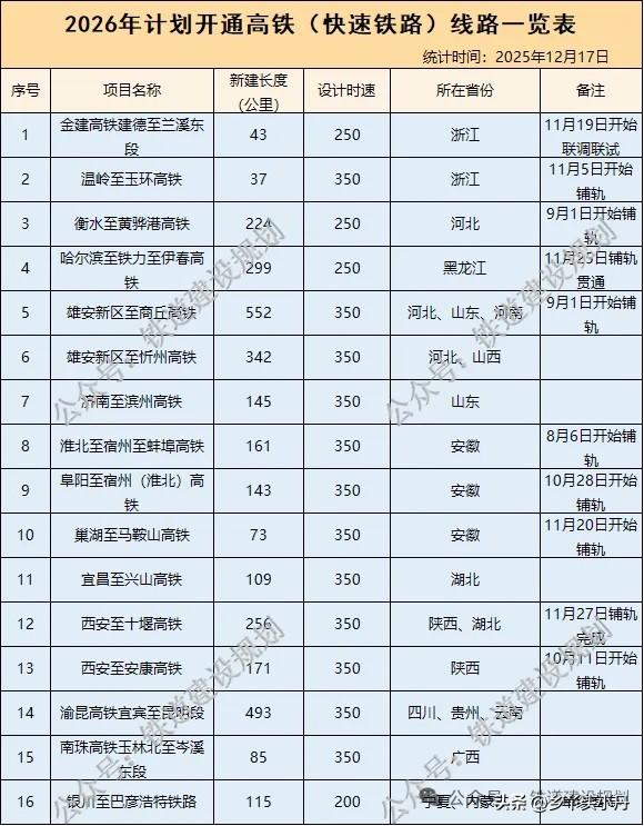 好消息!根据最新规划,2026年我国高铁网络将迎来显著扩展,预计新开通线路达16条,其中“八纵八横”主通道项目占比超过60%,标志着国家骨干交通网进一步完善。截至目前,2025年已开通高铁6条(段),新增里程约988公里,看看经过你的家乡吗? 下面我们来简单介绍一下,2026年的重点项目包括: 一、雄商高铁计划于明年9月开通,新建里程552公里,成为当年开通里程最长的线路; 二、雄忻高铁原定2027年3月竣工,有望提前推进; 三、渝昆高铁宜宾至昆明段全长493公里,进度顺利,预计明年投入运营。 四、西十高铁。 五、西康高铁将强化中西部连接。 六、宜昌至兴山高铁。 七、济滨高铁助力山东半岛互联。 八、南珠高铁玉林至岑溪段完善两广通道; 九、哈尔滨至伊春高铁打通东北高寒地带; 十、衡水至黄骅港高铁促进京津冀出海; 十一、金建高铁建德至兰溪段优化浙中网络; 十二、巢马城际提升皖江通行效率; 十三、温岭至玉环高铁服务沿海经济带; 十四、淮宿蚌与阜淮高铁加密华东路网; 十五、包银高铁银巴支线推动西北开发; 十六、成达万高铁资阳至达州段和渝万高铁加速成渝双城圈融合。 总体来看,2026年高铁开通潮呼应了“十五五”交通规划目标,到2025年全国高铁里程预计达5万公里,2035年基本建成“全国123出行交通圈”,值得期待!