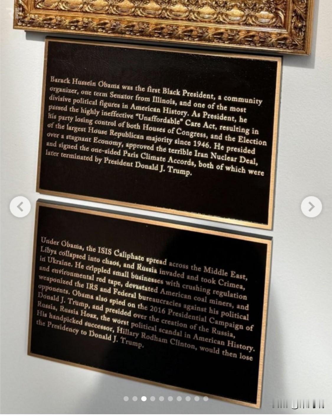 突发新闻:白宫巴拉克·奥巴马画像下方的一块牌匾称他为“美国历史上最具争议的政治人物之一”。 这些牌匾是由唐纳德·J·特朗普总统在白宫“总统名人堂”走廊中添加的。 文字内容高度党派化,对前总统奥巴马和现任总统拜登(当时的当选总统)做出了负面描述。 关于奥巴马的牌匾还提到《平价医疗法案》“极其无效”、伊朗核协议“糟糕”以及他签署了“片面的《巴黎气候协定》”。 这些牌匾在当时引起了媒体的广泛关注和争议。