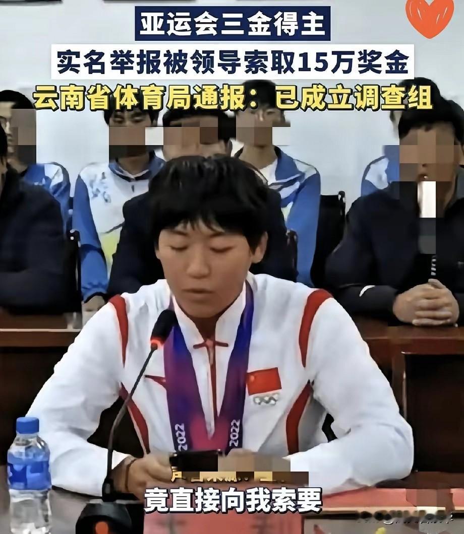 云南这事儿,终于藏不住了! 范某文停职,督导组火速进驻,这动静明摆着——纸根本包不住火。 盯着那15万“奖金”,越看越心寒。 这哪是什么奖励,分明是照妖镜,把某些人的贪婪扒得一干二净。 上面三令五申,奖金必须“直达个人”,就是怕有人在中间动手脚、赚差价。 可到了基层,有些人还是敢顶风作案,硬生生把手伸进了冠军的口袋里。 这根本不是“索要”,是明抢! 运动员十几年摸爬滚打,流血流汗拿了荣誉,本该得到的回报,却成了某些人的“唐僧肉”。 他们把运动员当成自家私产,当成没有感情的印钞机,完全忘了冠军背后的付出与牺牲。 更讽刺的是事后补救。 又是给运动员做心理疏导,又是宣布“退役无效”,早干嘛去了? 当初截留奖金的时候,怎么没想过运动员的感受? 非得等舆论发酵,把脸扇肿了,才急着找药膏敷,这波操作,虚伪到让人作呕。 运动员的成长有多难? 从小离开家,日复一日训练,伤病缠身是常态,能站上领奖台的,都是从千军万马中拼出来的。 国家投入资源培养,就是为了让他们安心拼搏,可有些人却在背后搞小动作,寒了运动员的心。 这事儿绝不是个例。 体育圈的潜规则,早该好好查查了。 多少运动员的奖金被克扣? 多少本该公平的选拔被操控? 表面光鲜的荣耀背后,指不定藏着多少见不得光的交易。 别光顾着拍苍蝇,这浑水底下,大概率还连着更粗的利益链。 督导组既然来了,就该顺藤摸瓜,一查到底。 不仅要追回被截留的奖金,更要揪出背后的始作俑者,打破那些盘根错节的潜规则。 运动员的荣誉不容玷污,他们的付出值得尊重。 要是连基本的劳动报酬都保不住,谁还愿意为国拼搏? 严查到底,才能给所有运动员一个交代,才能让体育圈回归纯粹。 各位读者你们怎么看?欢迎在评论区讨论。