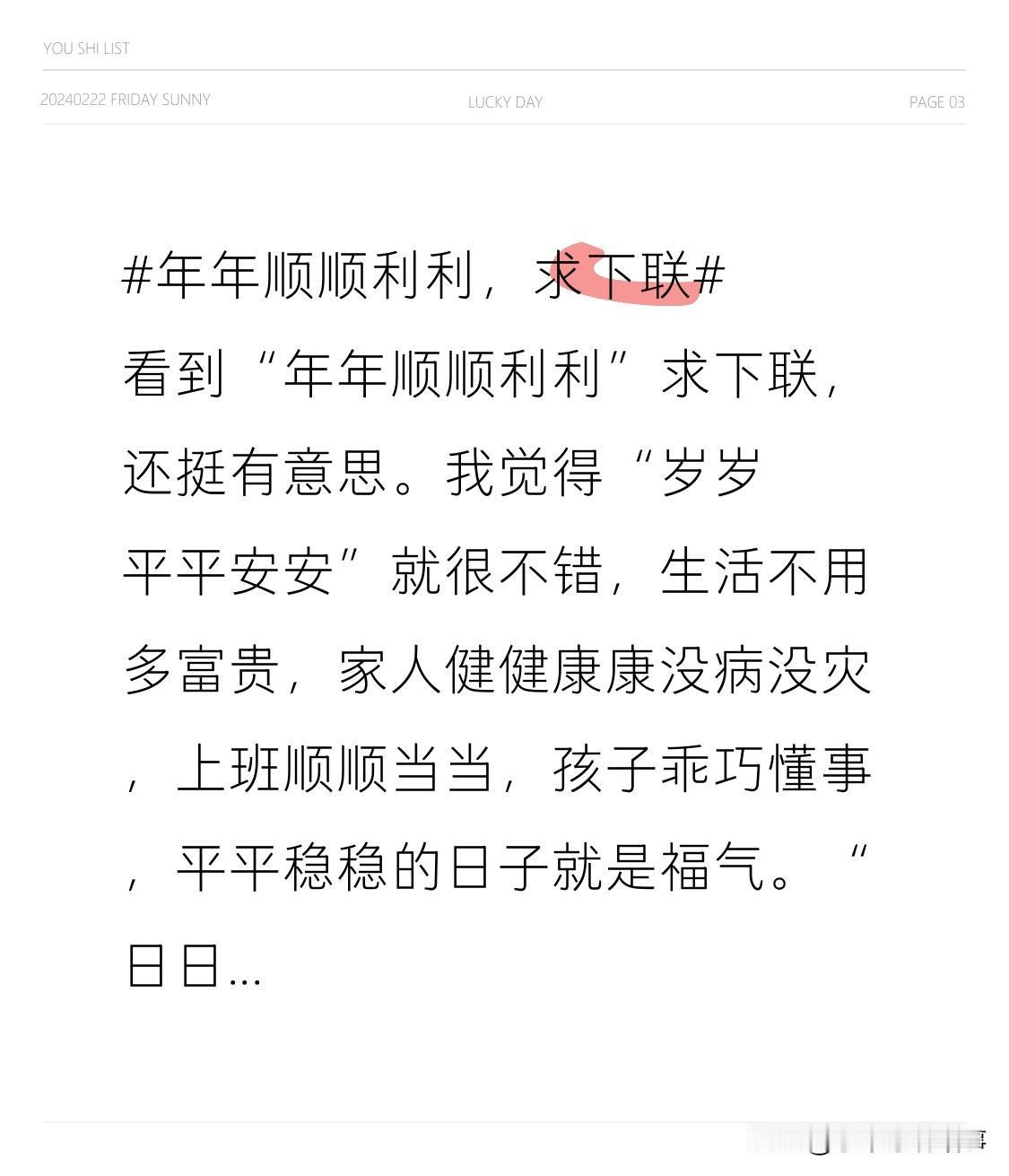 看到“年年顺顺利利”求下联,还挺有意思。我觉得“岁岁平平安安”就很不错,生活不用多富贵,家人健健康康没病没灾,上班顺顺当当,孩子乖巧懂事,平平稳稳的日子就是福气。“日日有奔头”也挺好,工资够花、房贷慢慢还完,老人身体安康、孩子积极上进,每天有点小盼头,踏实生活就知足。“事事不烦心”也贴合,买菜不被坑,工作没糟心事,邻里、家人都和睦,没烦恼的日子就是好日子。当然“全家乐呵呵”也棒,热菜上桌,饭后唠嗑,有事一起商量,一家人其乐融融,比啥都强。