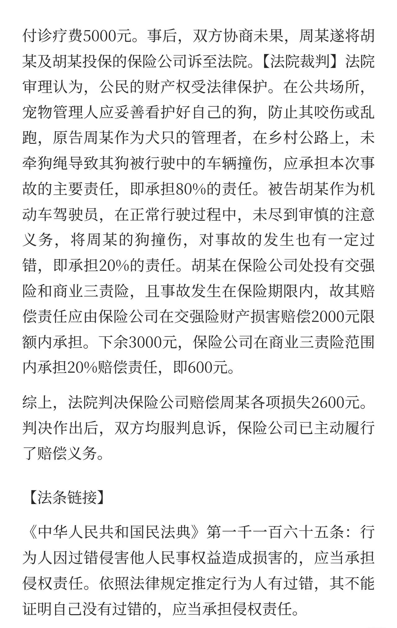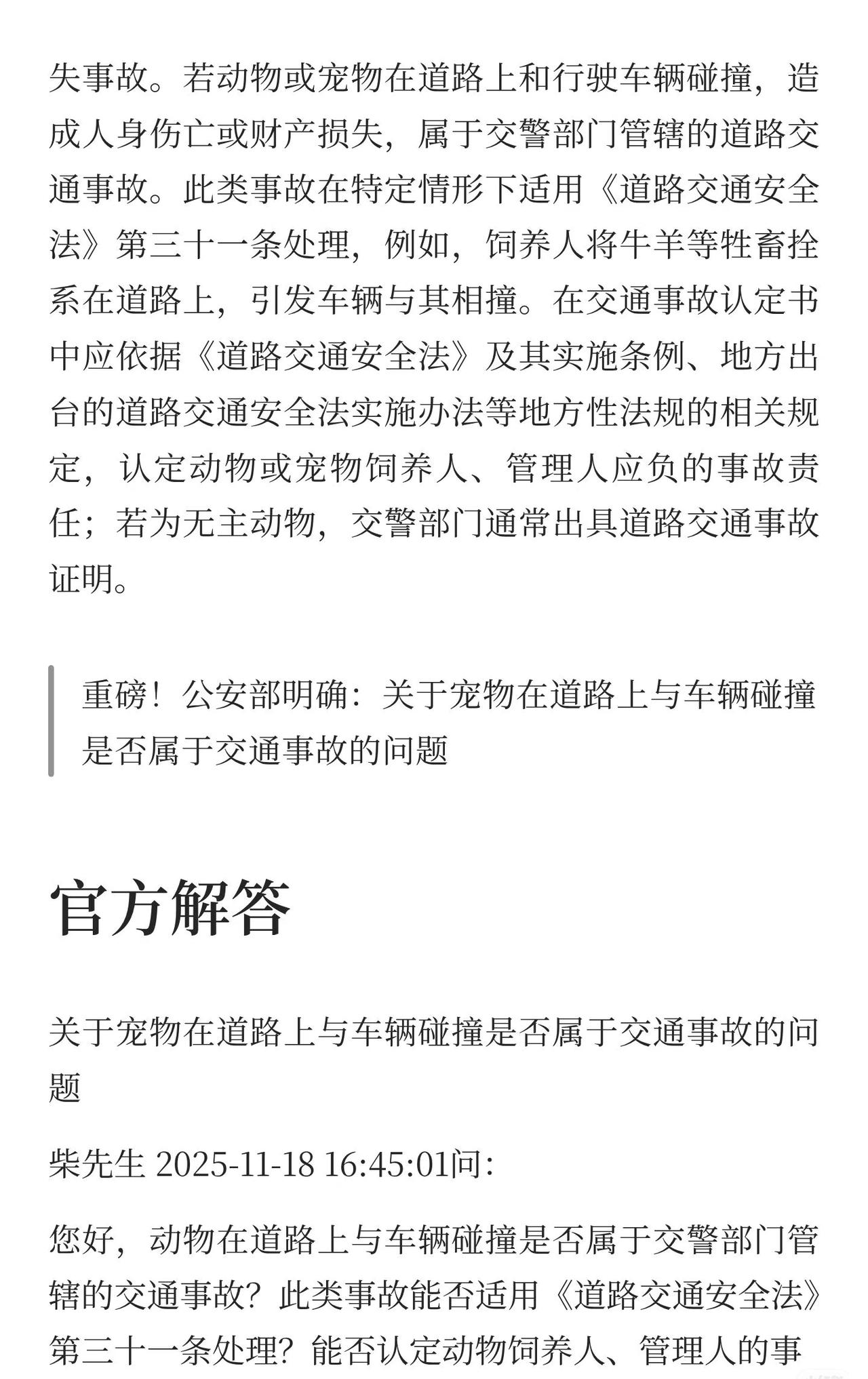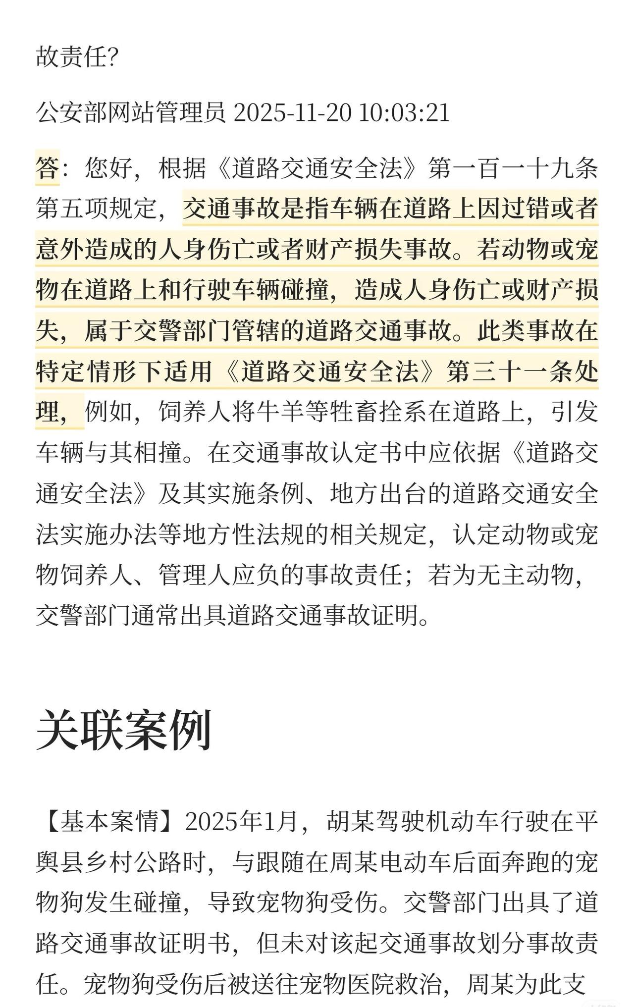 公安部:关于宠物在道路上与车辆碰撞! 公安部明确,宠物在道路上与车辆碰撞导致的人身伤亡或财产损失属于交通事故,适用《道路交通安全法》处理。事故责任由宠物饲养人或管理人承担,无主动物则出具交通事故证明。