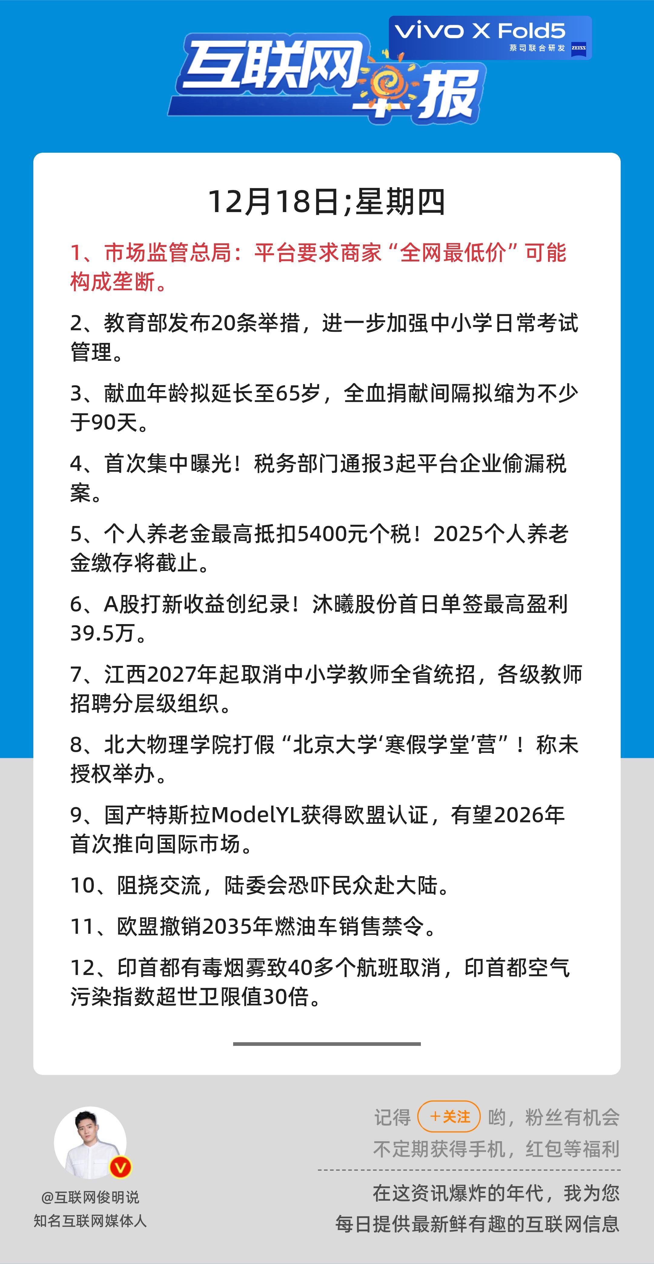 12月18日,星期四,《第2991期》;互联网早报,众览天下事关心第1条:市场监管总局:平台要求商家“全网最低价”可能构成垄断;早安————————————点击右上方关注每天一分钟众览天下事,互联网早报值得拥有! 更多精彩,欢迎加入粉丝群俊明和他的朋友们