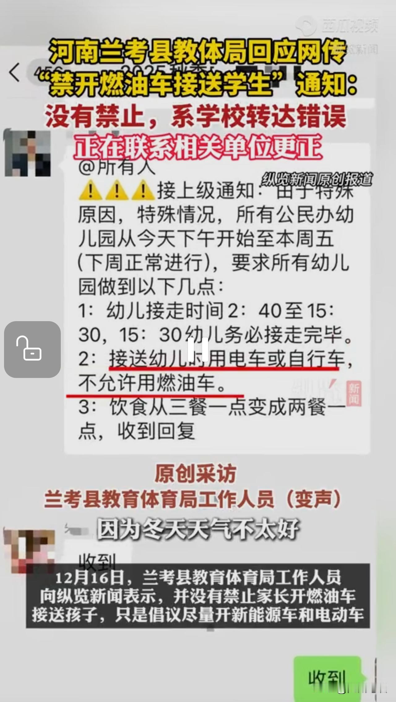 疑似为了迎接“检查”,河南一地“禁止”家长用燃油车接送孩子! 家长:燃油车,太难了!天寒地冻,不让开燃油车接送孩子! 为了环保,只能开新能源车或电动车! 那么,相关部门有没有以身作则,率先不开或者少开燃油车呢?既然倡导一公里内步行,自己出门一公里内有没有选择步行呢? 冬天雨雪少,空气质量会变差,这是事实。 原因是多方面的,汽车尾气排放是一个原因,烧煤烧柴火也是一个原因。 只能是尽量改善,并不好完全禁止吧? 煤气好用,但是要钱啊! 烧柴火不用钱啊,可能是自家树木的残枝枯叶,二次利用而已。大部分农村人毕竟收入来源少,能省则省罢了。 还是说农民用燃气可以有优惠,比烧煤烧柴还便宜吗? 开电动车又不让用挡风被,冬天那么冷,到处冰天雪地的,开电动车也是不容易。