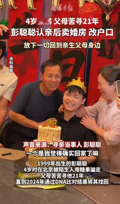 4岁被拐,亲生父母寻他21年,小伙认亲后把养父母给的婚房和车子都还了还去,果断回去和亲生父母相聚!小伙:“这些东西本来确实是给我准备的,但也确实不属于我!”网友:他的做法也让买家明白,别人的儿子养不得,也间接性减少了人口买卖,很有正面意义! 25 岁的彭聪聪与亲生父母相认后,果断退还养父母准备的婚房和车子,辞掉工作、迁走户口,全力回归原生家庭。 一句 “这些东西确实是给我的,但本来就不该属于我”,让网友们吵得不可开交。 咱倒着说这事儿,认亲现场的画面至今让人破防。 亲生父母赶过来时,头发已白了大半,一见到彭聪聪就死死抱住,哭得直不起腰,嘴里反复念叨 “我的儿,可算找到你了”。 彭聪聪也红了眼眶,拍着父母的背不停安慰,这一幕被传到网上后,瞬间引发热议。 谁也没料到,感动还没散去,彭聪聪就向养父母提出退房车的决定。 养父母当场愣住,养母拉着他的手不肯放:“我们养你这么多年,买车买房都是为你,怎么说退就退?” 彭聪聪态度坚定却带着愧疚:“我记着你们的养育之恩,但一想到亲生父母找了我 21 年,我实在没法心安理得拿着这些。” 没过几天,他就办好了所有手续,把房车完完整整地还了回去。 时间拉回 21 年前,4 岁的彭聪聪在老家门口玩耍时,被陌生男人用糖果诱拐,从此与亲生父母失联。亲生父母发现孩子不见后,疯了似的四处寻找,贴遍寻人启事,跑遍大半个中国。 他们放弃工作,睡过火车站长椅,吃过最便宜的泡面,哪怕被骗无数次,也从没放弃,甚至没再生育,把所有希望都寄托在寻子上。 而彭聪聪被拐后,被现在的养父母收养。养父母没有孩子,对他还算不错,供他读书、找工作,还花光积蓄买房买车,就等他成家。 彭聪聪一直知道自己是收养的,却从没听说被拐的真相,直到警方通过 DNA 比对找到他,他才知道亲生父母为找他吃了这么多苦。 认亲后,彭聪聪没丝毫犹豫,立刻辞掉养父母所在城市的工作,把户口迁回亲生父母家。他说:“他们失去了我 21 年,我想用余生好好陪伴,弥补这份遗憾。” 这事儿发酵后,网友们彻底分成两派。支持彭聪聪的网友直言:“三观太正了!养父母的 21 年天伦之乐,是建立在亲生父母的痛苦之上的。 这波操作给买家敲响警钟,别人的儿子养不得!” 还有人点赞:“第一次见这么拎得清的,没被房车诱惑,果断回归原生家庭,太勇敢了!” 同情养父母的网友则觉得委屈:“养父母真心对他,买车买房当亲儿子养,说走就走还退东西,太不顾及他们感受了,养育之恩就这么不值钱?” 也有人说:“可以两边照顾啊,没必要做得这么绝,血浓于水,养育之恩也不能忘。” 其实彭聪聪并没完全断绝和养父母的联系,会定期打电话、逢年过节探望。但他明确表示,会把更多时间留给亲生父母:“现在的我,才真正有了家的感觉。” 彭聪聪的选择,触及了人口买卖这个沉重话题。网友争论的核心,本质是 “养育之恩” 与 “被拐伤害” 的碰撞。 但不可否认,他的做法给妄图买卖孩子的人敲响了警钟:孩子不是商品,就算养几十年、花再多钱,也改变不了被拐的事实。 没有买卖就没有伤害,人口买卖毁了无数家庭。希望所有被拐的孩子都能像彭聪聪一样,早日找到回家的路,也希望这种丑恶现象能彻底消失。对于彭聪聪的选择,你站哪一边?欢迎在评论区留言。