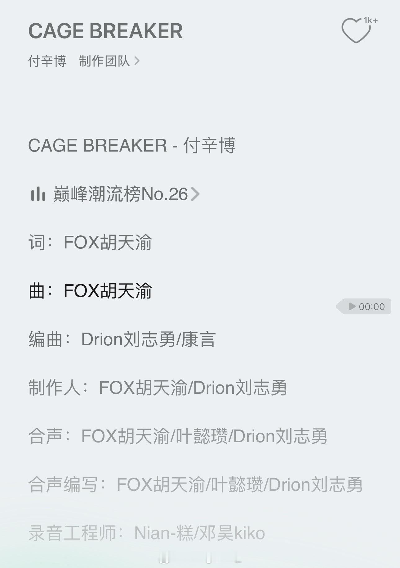 付辛博发布新歌《CAGEBREAKER》!作词作曲制作人全是福克斯!付辛博