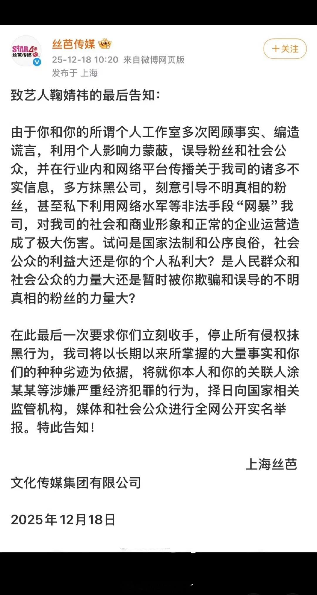 丝芭喊话鞠婧祎了:“我司将长期以来掌握的大量事实和你们种种劣迹…”啊?这?