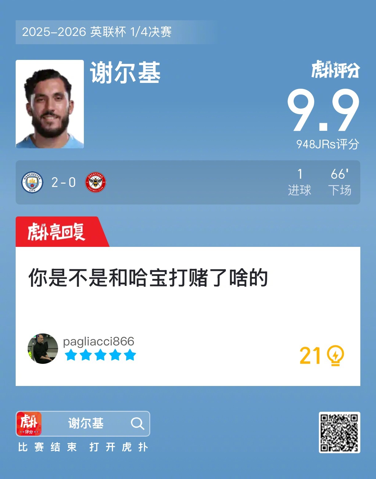 曼城2比0布伦特福德谢尔基打进一球,赛后收获9.9的虎扑评分!