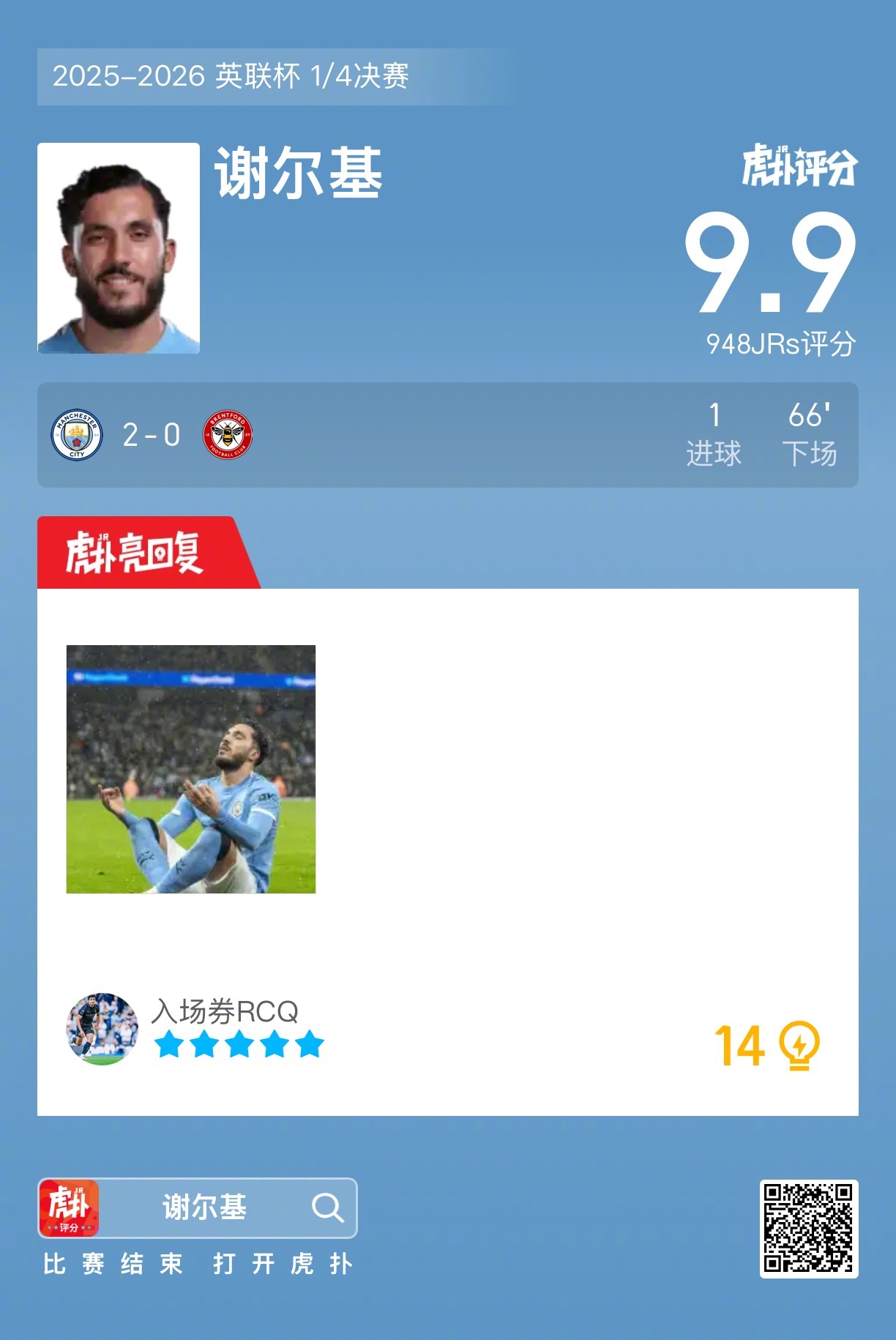 曼城2比0布伦特福德 谢尔基打进一球,赛后收获9.9的虎扑评分!
