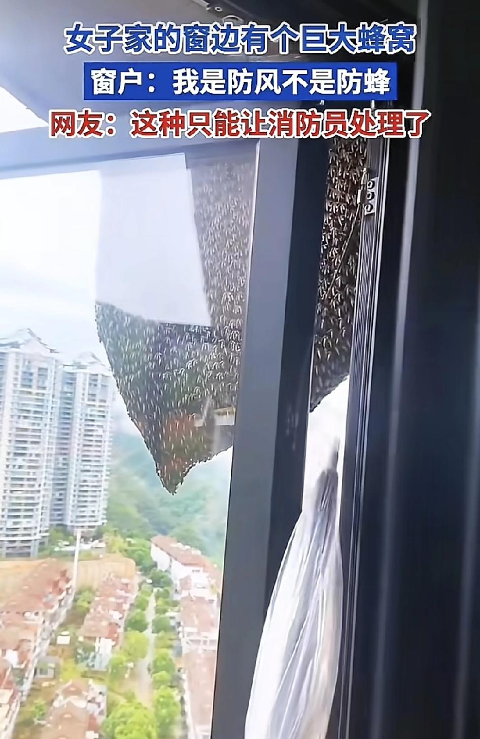 女子发现自家阳台窗户外面有一个巨大的蜂窝,尝试着用雨伞并去捅它,刚开始就被吓到了,赶紧把窗户关上,遇到这种情况一定不能盲目处理。只能打消防的电话,要消防员来清除,盲目处理极有可能被马蜂蛰伤。也有网友建议一定要把蜂王去除,蜂王走了,其他的风也会跟着走。