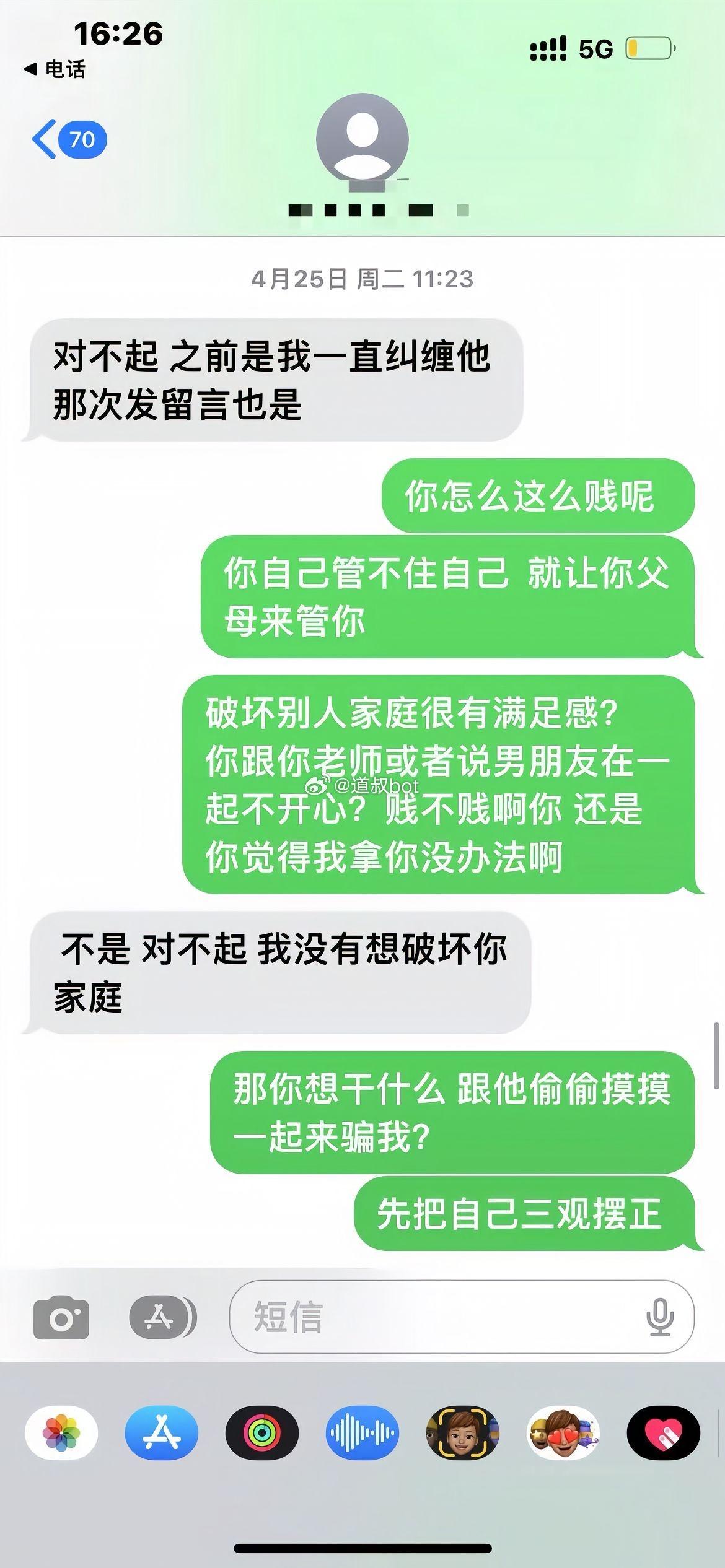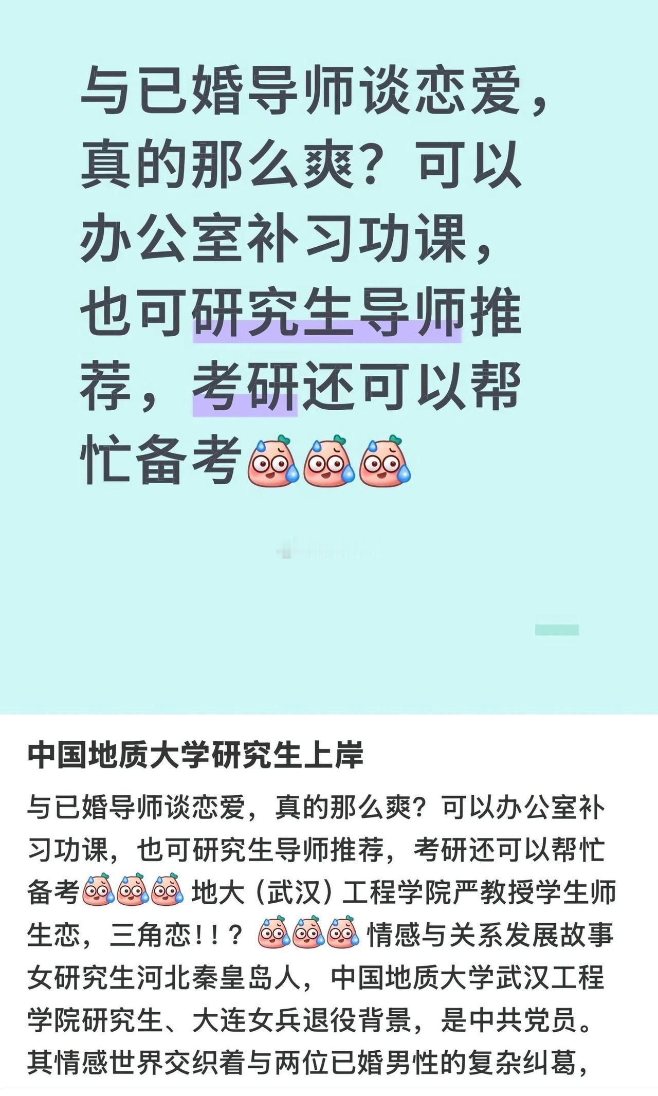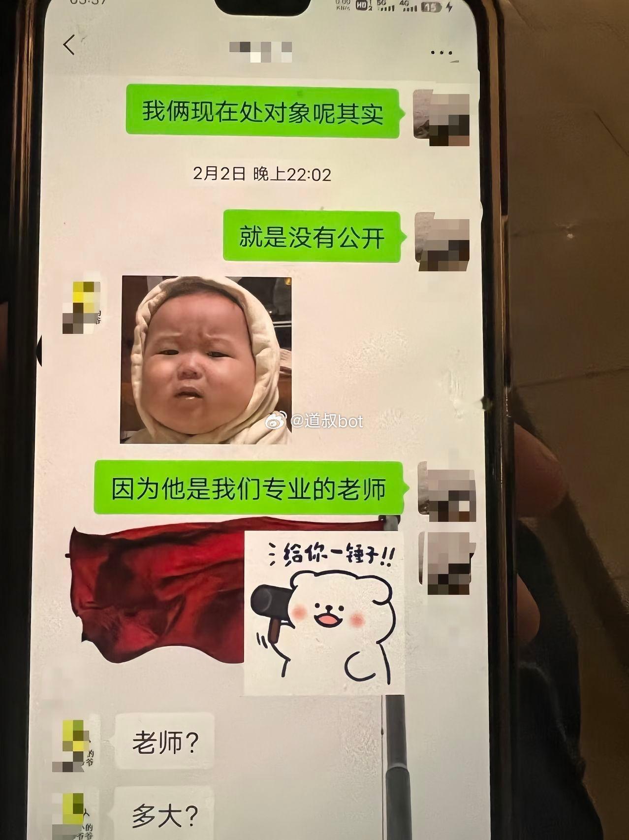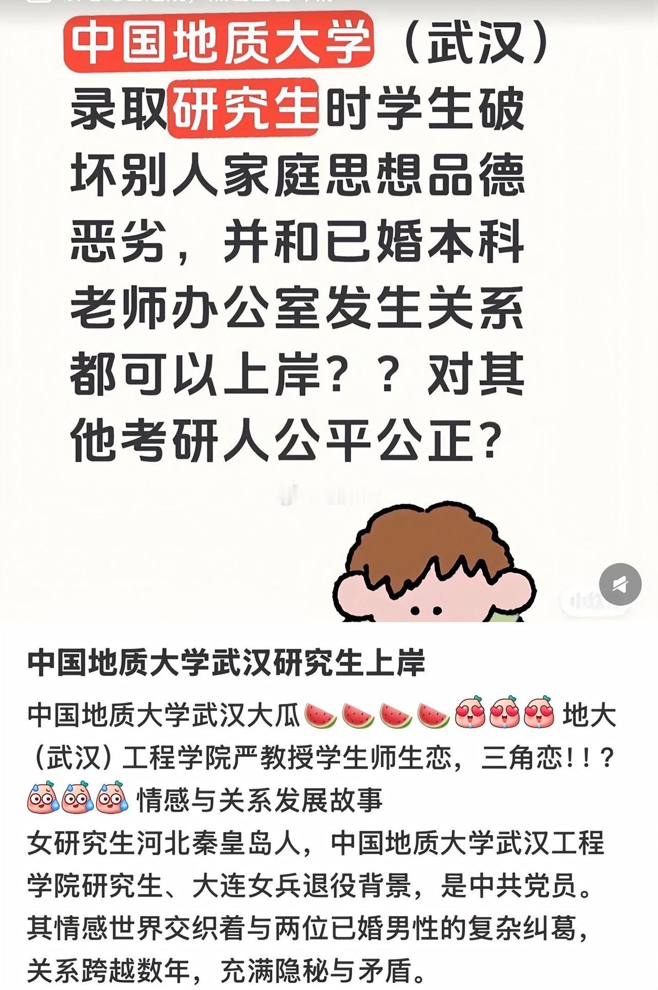 武汉地质大学的瓜,女研究生勾引已婚老师,就为上岸?爆料的称这位女生是河北秦皇岛的,女兵退役,存在和两位老师、教授的三角恋,感情纠葛。两个老师都是有妇之夫。据说她能上岸研究生,和老师关系匪浅。流出的聊天记录,里面也是劲爆。有些老师真的是衣冠禽兽,利用手中一丁点权力,对女学生肆意妄为。而这个女生显然不是省油的灯,半推半就,轻解罗裳。所以两个王八绿豆,各取所需。其中一个老师的老婆发现了女生发的微信,质问她为什么这么贱?破坏别人家庭有满足感吗?武汉大学丑闻