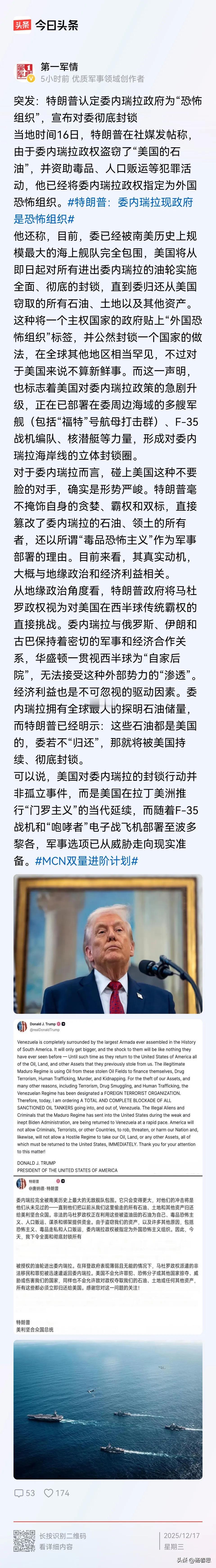 从未见过如此厚颜无耻之人、之政府、之国家!特朗普竟然宣布委内瑞拉国内的石油是美国的石油,威胁马杜罗说,如果不归还美国石油,就要对他动武,动武的理由都想好了,说马杜罗是贩毒贩卖人作器官集团的首脑,美国特朗普政府这也太强盗无耻行径了,连洗衣粉都免了,就安个莫须有的罪名,就开始想下手了。 网友:可见世界规则从来没变过,真理永远建立在大炮射程之内,任何对文明的修饰,只是在大炮的外表修饰了一个花边而已。 特朗普的大金主就是美国能源集团,明抢委内瑞拉石油,一则献媚讨好,二则震慑拉美。 特朗普说这些话以经不意外不新鲜了,加拿大是美国的第五十一个洲,格陵兰岛也是美国的,你觉得出奇吗? 美西方所谓的文明,不过都是用殖民全世界的财富来包装自己罢了。一旦没有了财富,就开始露出獠牙了。