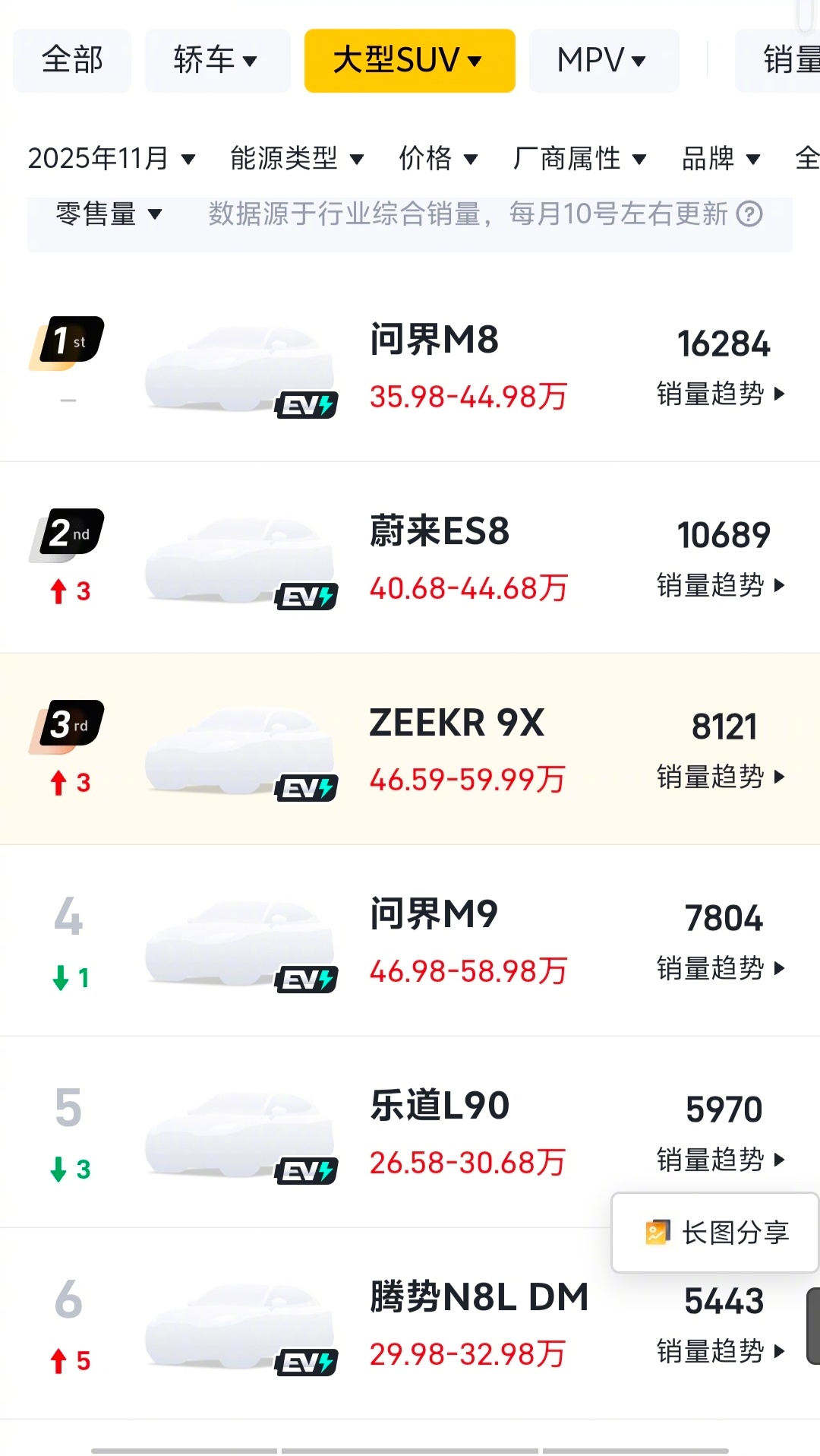 不知不觉间,“杭州湾库里南”极氪9X的销量升到大型SUV的第三了。