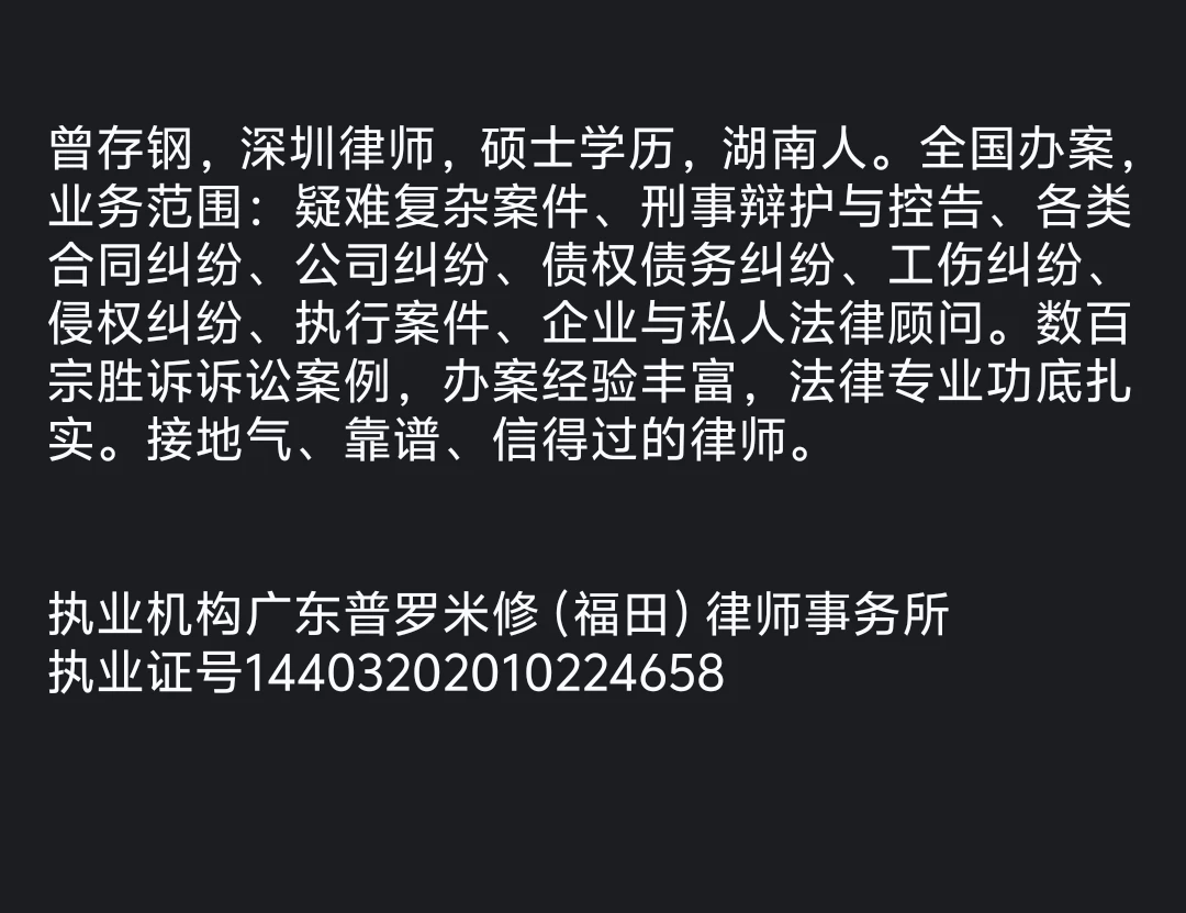 曾存钢,深圳律师,硕士学历,湖南人。全国办案,业务范围:疑难复杂案件、刑事辩护与控告、各类合同纠纷、公司纠纷、债权债务纠纷、工伤纠纷、侵权纠纷、执行案件、企业与私人法律顾问。数百宗胜诉诉讼案例,办案经验丰富,法律专业功底扎实。接地气、靠谱、信得过的律师。
