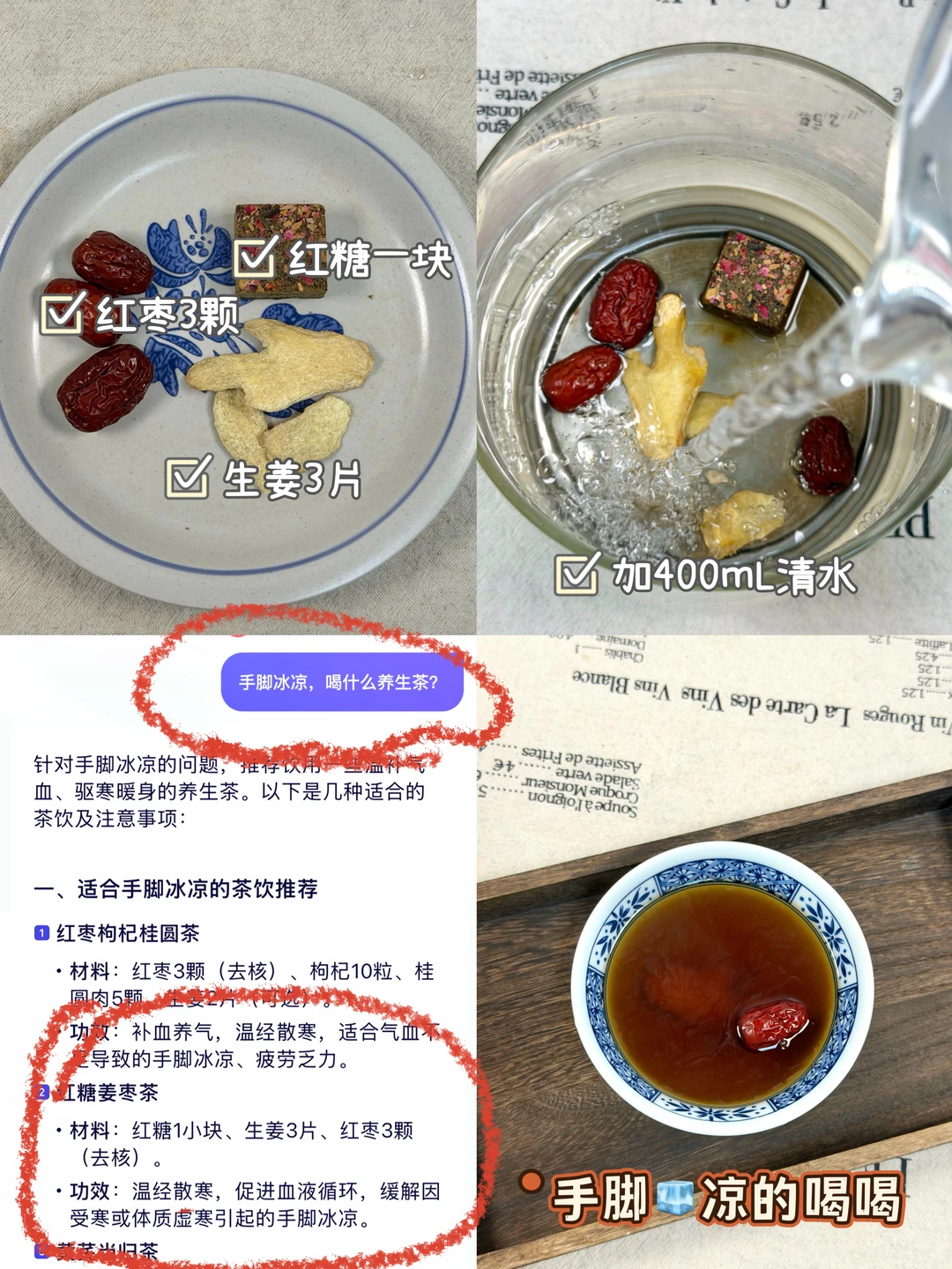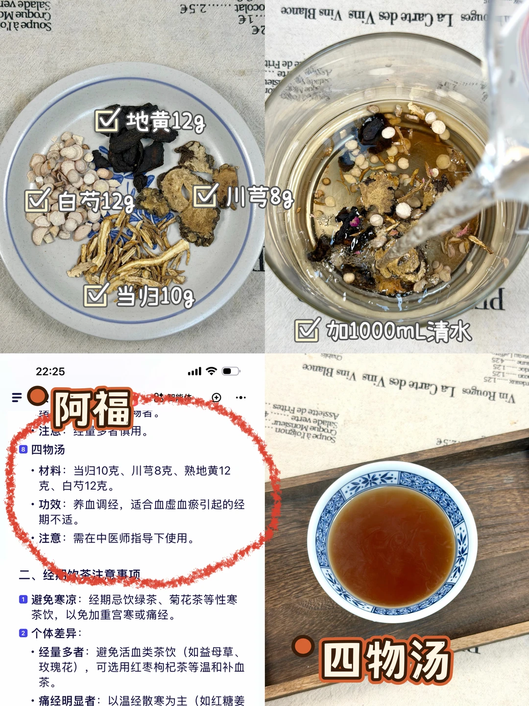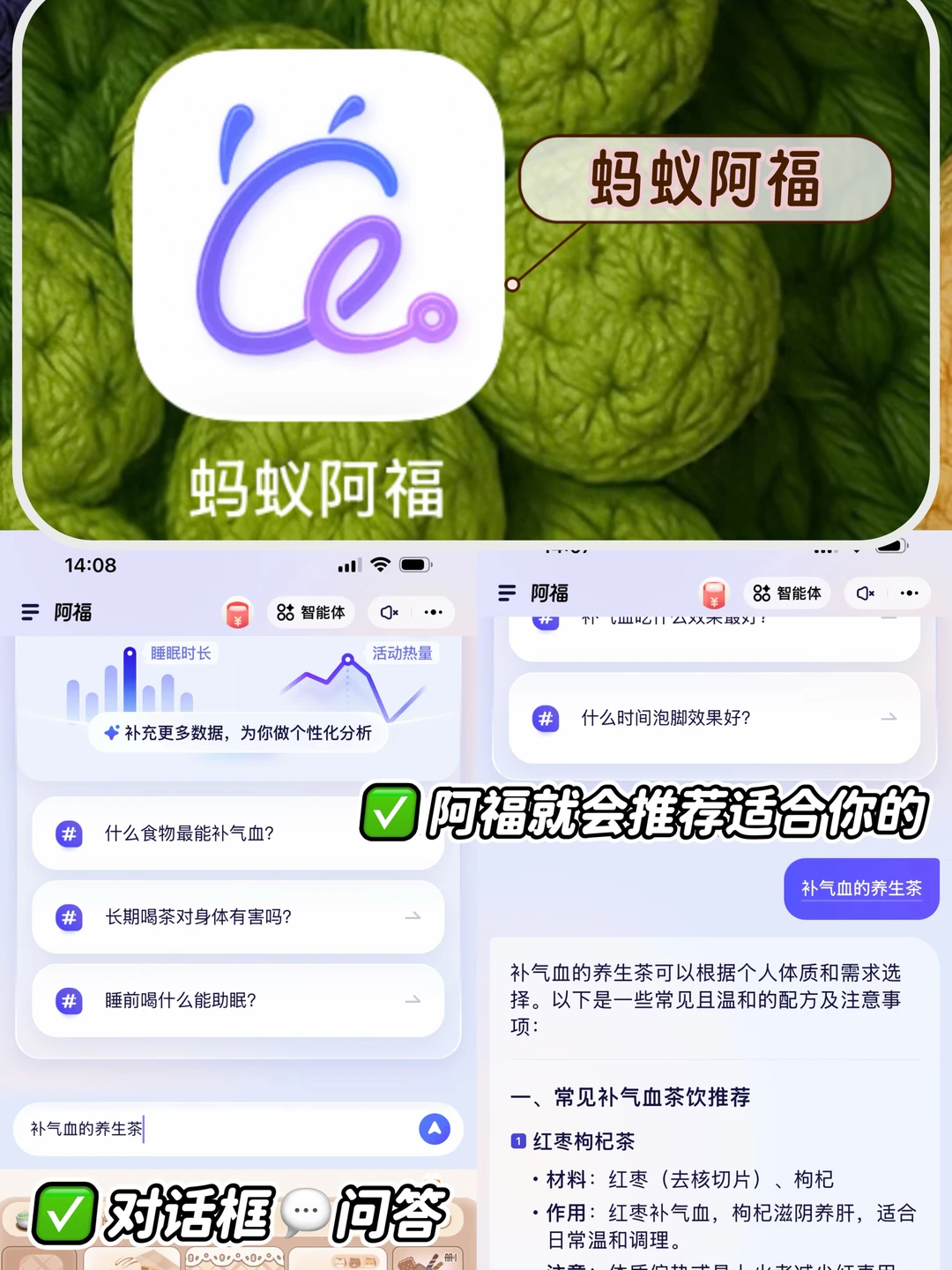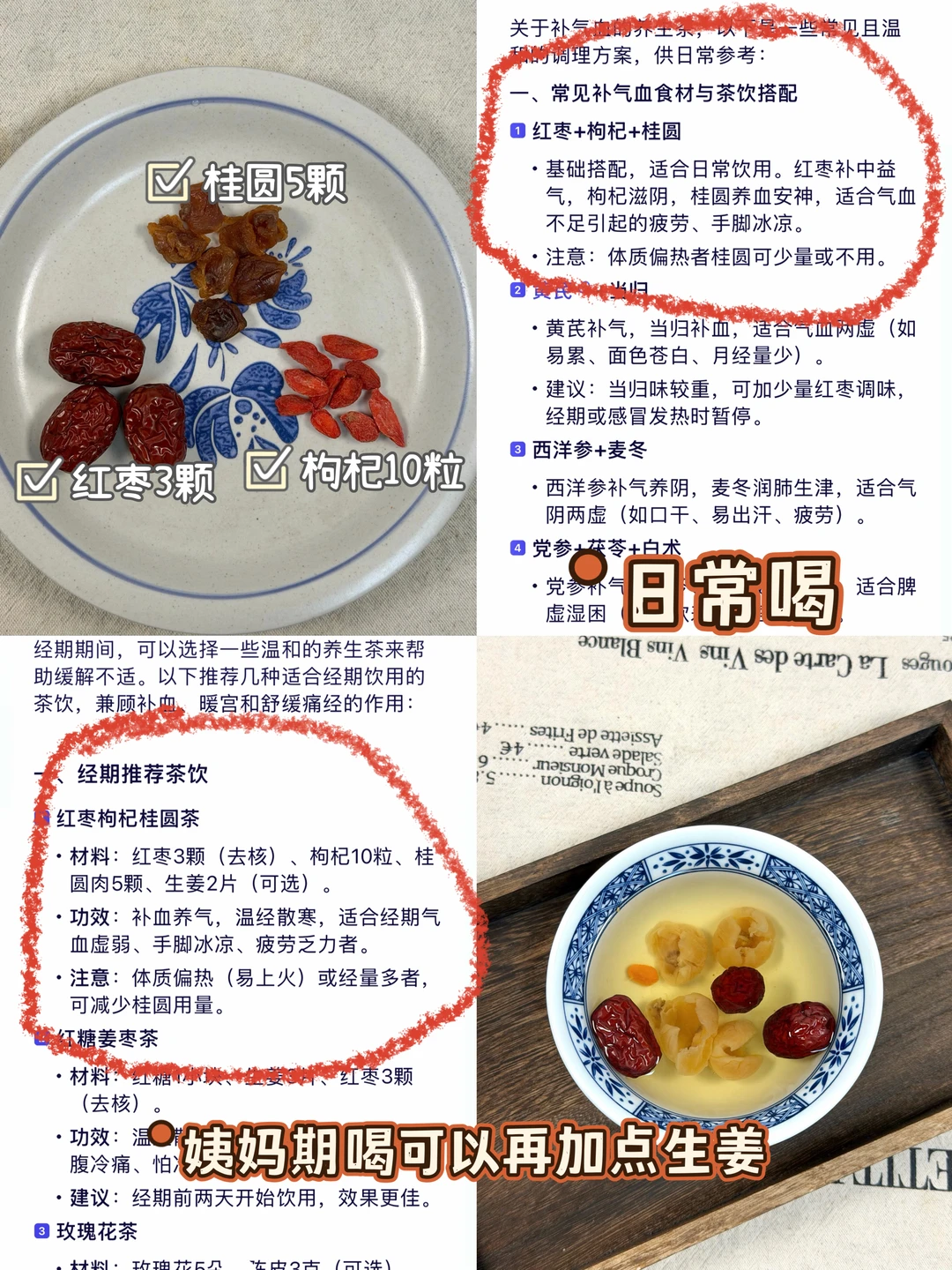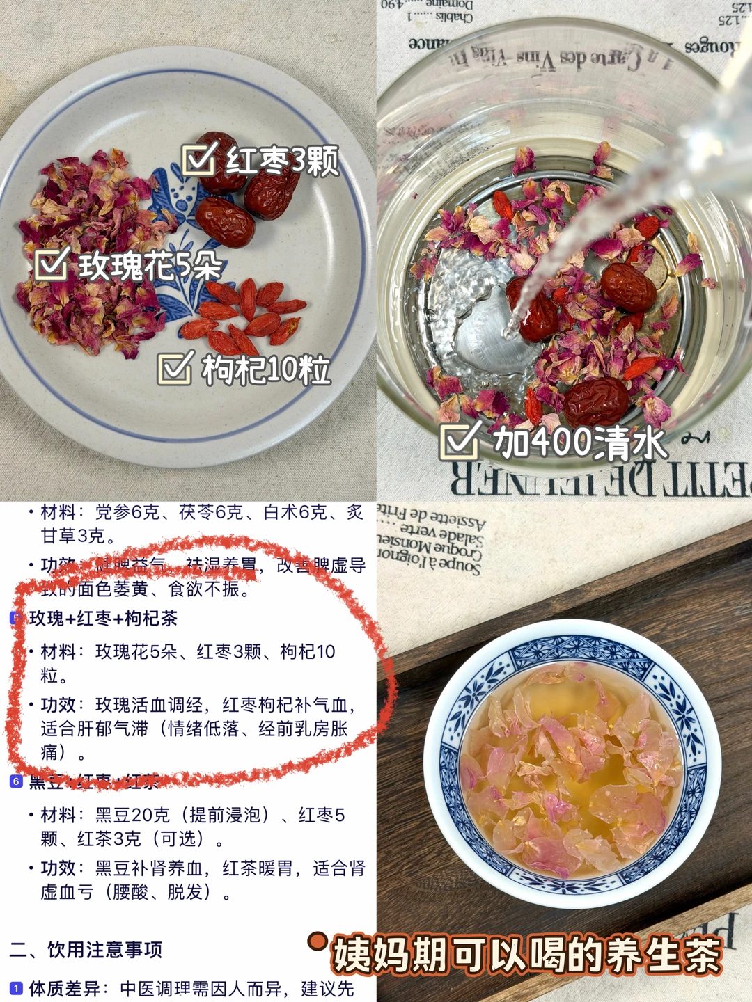 今天分享我在阿福搜到的6种补气血的养生茶搭配! 连喝几天……小脸红扑扑的。 以前喝养生茶的时候都要看养生书📖,查找。有了这个阿福真的很方便,不看养生书也能变成养生小达人。实用也很方便,点击阿福图标对话框,输入补气血的养生茶,还帮我科普了经期喝的养生茶、养生茶怎么搭配、姨妈期间喝什么养生茶、手脚冰凉喝什么养生茶等很细节很全面的知识。 比我们在网上乱搜信息靠谱多了。AI时代在这一刻具象化了,合理运用工具,让我们的生活更加便捷。 养生不费脑,阿福全知道。不知道怎么选择适合自己的养生食谱可以阿福把自己的症状输入进去,让阿福分析属于自己量身定制几款适合自己的食谱。 1·红枣➕枸杞➕桂圆 2·玫瑰花➕红枣➕枸杞 3·黑豆➕红枣➕枸杞 4·红枣➕红枣➕生姜 5·当归➕红枣➕黄芪 6·当归➕川芎➕地黄➕白芍 ✅做法:把食材放入养生壶/砂锅里煮开再煮15分钟即可。 🌈姐妹们这个阿福除了推荐补气血的养生茶,还有很多功能,比如AI诊室、拍照解析、小目标、小提醒,很实用也很方便,真就是移动的健康小管家,方便又贴心😊