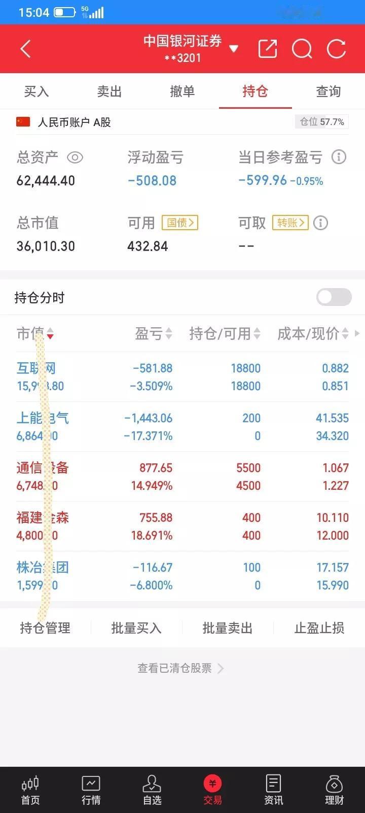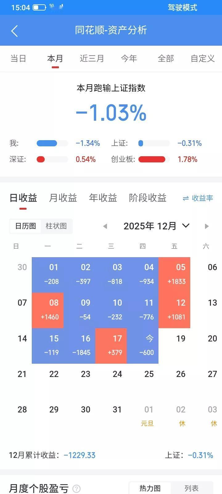 2025.12.18,今天又是悲催的一天,昨天忍痛把亏损下跌的垃圾股都清仓了,留下1只还有一点盈利的和2只昨天反弹上涨的股票,认为顺大盘上涨,应该是强势好股票,但是卖掉的今天补涨了,留下的逆市大跌。股票数量减少了,亏损并没有减少,反而大亏,左右打脸。 昨天早上集合竞价没有买上能,上能反而上涨了,心想今天不能像昨天那样错过了,于是集合竞价以35.89买入100股,想做t,但是今天和昨天完全相反,今天开盘价就是最高价,一路大跌,一直心存幻想,安慰自己,只是洗盘,很快会反弹上涨,但是越跌越猛,最低跌到34.20,然后触底反弹,反弹的时候看到上证指数也大涨,怕踏空了,于是又冲到以34.60追高买入100股,谁知道又追在山顶上了,买入之后就又下跌了,挨打也要认错,收盘以34.33止损卖掉100股,今天做t失败,多亏了183元。 株冶早上也强势上涨,于是以16.10买入100股,但是下午反而跌下来了,收盘以15.99卖掉,做t失败,亏了12块钱。 通信设备etf大幅低开,集合竞价以1.220买入1000股,想收盘上涨卖掉,但是收盘也没有上涨,就当补仓了。 互联网etf也是下跌,以0.851买入100股。 今天股票数量少了,亏损比例反而更大了,早上计划16.60买入航天电子,但是差几分钱没有买到,不断上涨,不能再追高了,买到的大跌,没有买到的反而大涨,股市总是常常出现意外。 今天总市值3.6万元,总资产6.24万元,今天总体账户亏损601元。又是大亏的一天。