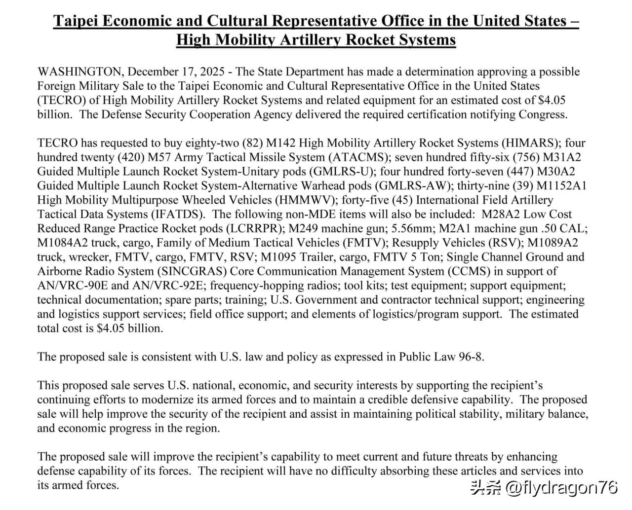 🔥🇺🇸关于向台湾地区供应美国榴弹炮和多管火箭炮系统 第一批物资 • 60门M109A7型155毫米自行榴弹炮 • 60辆M992A3型履带式弹药补给车 • 13辆M88A2型装甲抢修车 • 4080套精确制导组件(PGK) • 42套IFATDS型火炮火控系统 该批物资还包括M2A1型机枪、M795型155毫米弹药、通信设备、培训、备件、技术文件、后勤保障以及美国政府和承包商提供的支持。 第二批物资 • 82套M142“海玛斯”多管火箭炮系统 • 420枚M57“ATACMS”战术导弹 • 756枚GMLRS-U型制导导弹 • 447枚配备替代弹头的GMLRS导弹 • 39辆悍马军车 • 45套IFATDS系统