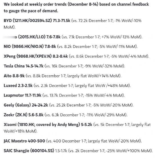 周订单数据出口转内销,中文版没有了,但是还有英文版,也挺好。 问界本月前两周差不多都是8800台,以此推算,12月估计有3.5万以上的订单,加上M7的存量订单,销量环比11月应该不会下降,整体还是相当稳健。 JI auto也在逐渐回血之中,12月也还有三万左右的订单。明年加大力度出海,应该还有一轮回光返照。 最牛B的我觉得还是尊界,稳稳的月均2000,这口碑真的是传开了,明年估计会更牛。