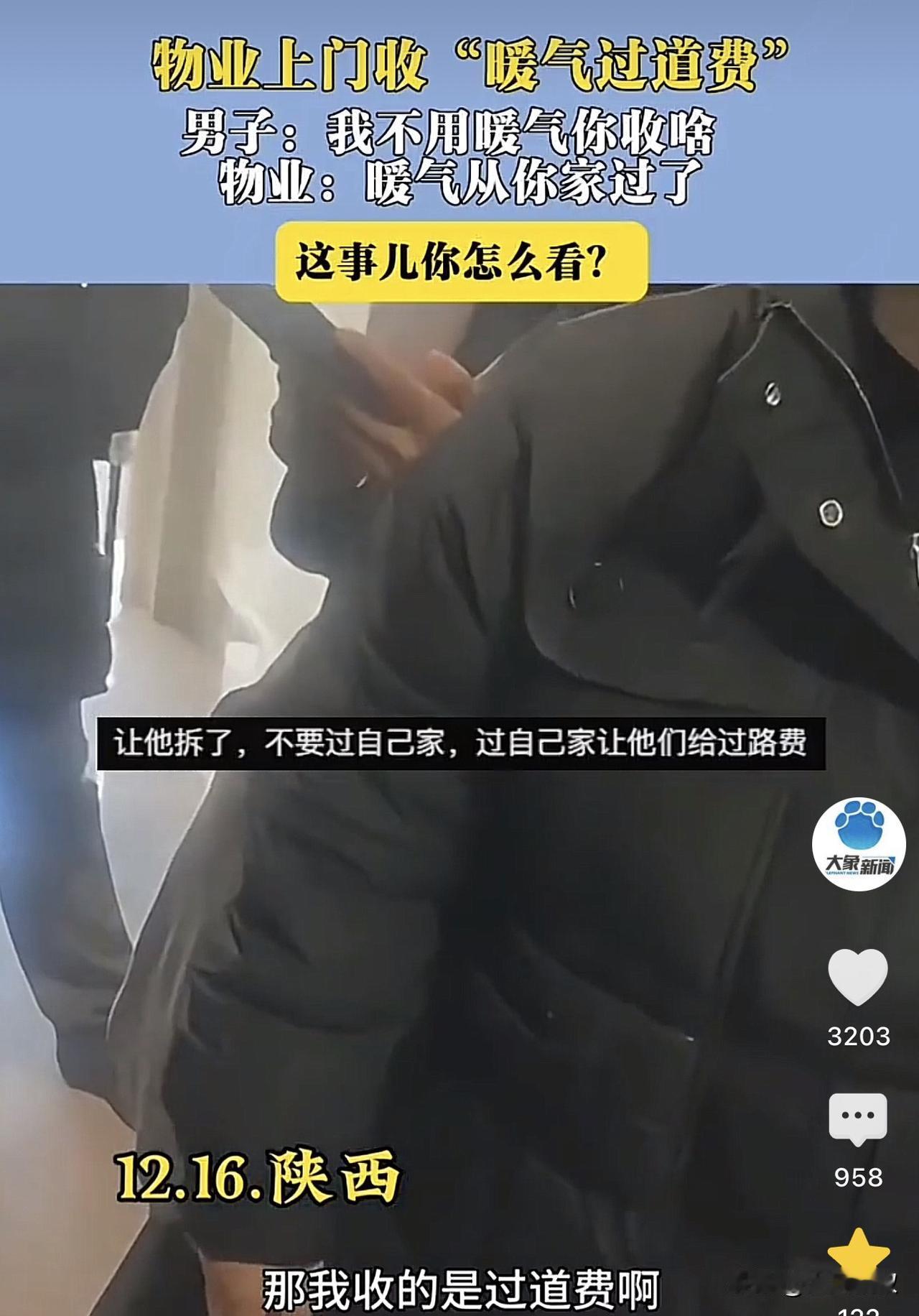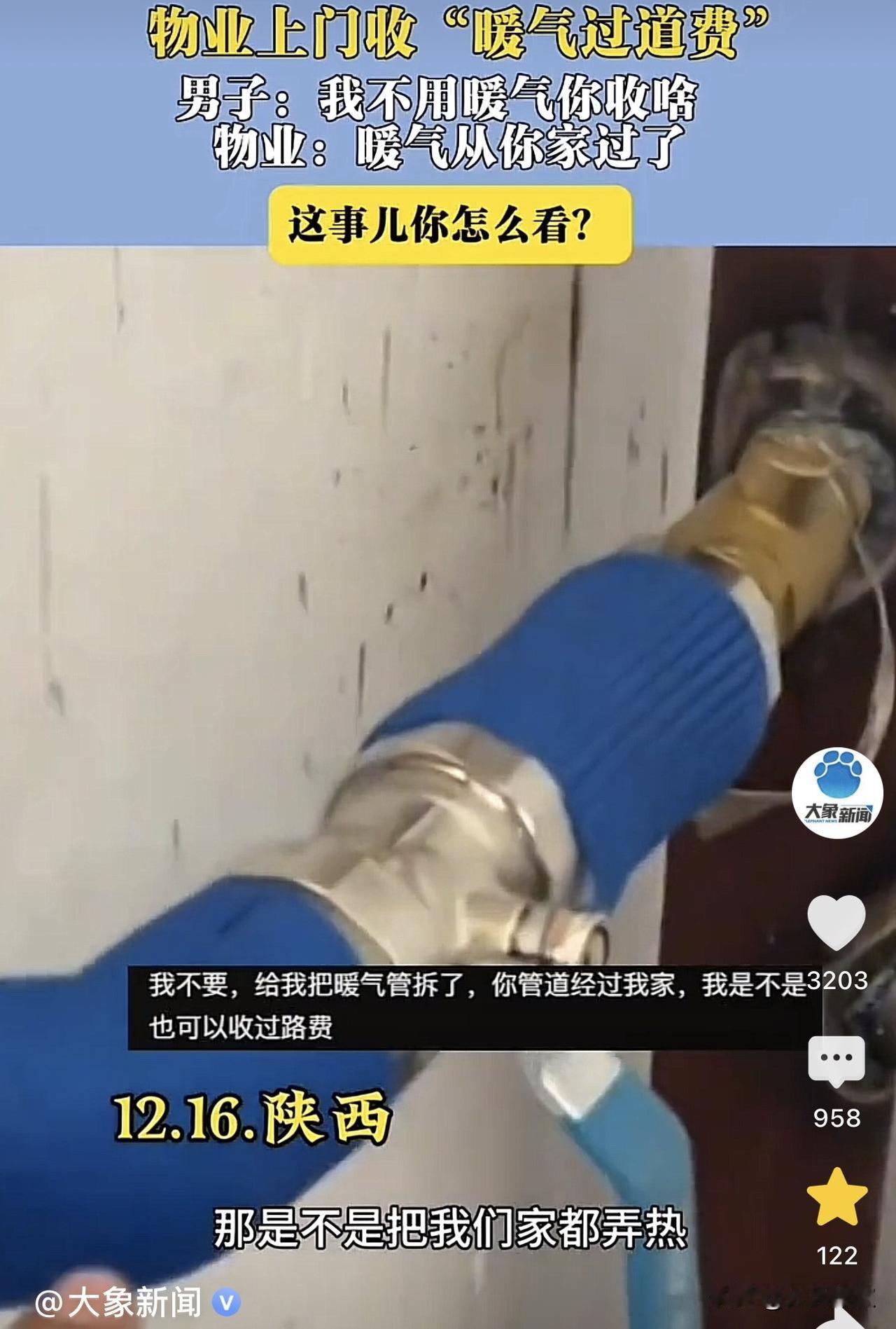 陕西,一男子租了一套房子,因为想着是自己一个人住,所以为了省钱,今年冬天男子就没有开暖气,让男子想不到的是,物业工作人员竟然找上了,要男子支付取暖费,男子很是疑惑自己明明没续费为什么要交暖气费?结果,物业却告诉男子,这是过道费,因为暖气从你家过了。 视频中,物业工作人员告诉男子,我们收的是过道费,因为暖气从你家走了。男子则质疑称,我家暖气又不热,热了我就交钱。物业工作人员则回应道,你交暖气费就热,你又没交暖气费,我们收的是过道费。男子表示,你收钱堵我家门干什么,大不了我们换个房子租。 视频一经发布,网友就立刻分成了两派,有网友表示,让他拆了,不要过自己家,过自己家就让他们给你过路费。 还有网友表示,过道费,没毛病,实际上这就是取暖费,经过你家必然会损失掉一部分热力,提高你家温度,你家作为受益人,应当承担部分费用。 也有网友质疑,之前有个人觉得家里暖气不热,就用燃气烧暖气,结果燃气烧的暖气要比统一供热热很多,于是这个男的找供热公司要求收取一定费用,所以,如果燃气公司要收取这个过道费,人家自家烧暖气的也可以要求供热公司付费。 其实,很多小区冬天暖气不热,在家里还要开空调,一方面是小区不交取暖费的降低了温度,另一部分,则确实是供暖公司在出水的时候,温度达不到要求,导致了入户温度低的原因。 但是,按照《住宅设计规范》和《民用建筑供暖通风与空气调节设计规范》的要求,对于符合现行国家住宅设计范围要求的住宅或经过建筑维护结构和供暖系统改造的住宅,卧室、起居室的温度不低于18℃。 因此,如果是正常供暖,只要温度达到了18℃就符合要求,而本案中,男子并未交取暖费,物业公司则以暖气通过男子家中为由,要求男子支付过道费,那么,这个费用是否合理合法? 实际上,站在供暖公司的角度来说,当用户在供暖期要求供暖公司停止服务时,供热设施和负荷并不会因为这个用户停热而减少,原因是供热公司仍然承担着管理的责任,为其配置供热设施、预留供热负荷,保留用户恢复用热的权益,因而会发生必要的固定成本费用。 而站在业主的角度来说,我没要求供热,即没让供热公司为我服务,你家管道从我家走,我应该让你交钱,而不是我交基础的过热费用。 当然,物业其实没有这样的权利上门催讨暖气费的。 根据《物业管理条例》第四十四条,物业管理区域内,供水、供电、供气、供热、通信、有线电视等单位应当向最终用户收取有关费用。 这说明暖气费应当由供热单位直接向最终用户收取。物业服务企业可以接受委托代收费用,但这并意味着物业有这样的职责。 所以,男子有权拒绝物业上门的追讨,毕竟自己不是拖欠物业费,即便物业获得了供暖公司的授权,在向业主追讨时,最起码要拿的出委托书,证明自己有这样的权限,不然的话,感觉物业管的太宽泛。 最终,男子交没交我们不得而知,但是,我们更希望这样的规定能够细化,细化到有人居住以及空置房屋的费用是否一致,以及自家用壁挂炉自采暖的业主,是否可以向供暖公司收取费用。 对此,你对本案有什么看法? —————————— 关注我,带你评析法律热点,关注冷暖人生。 文章原创,抄袭必究