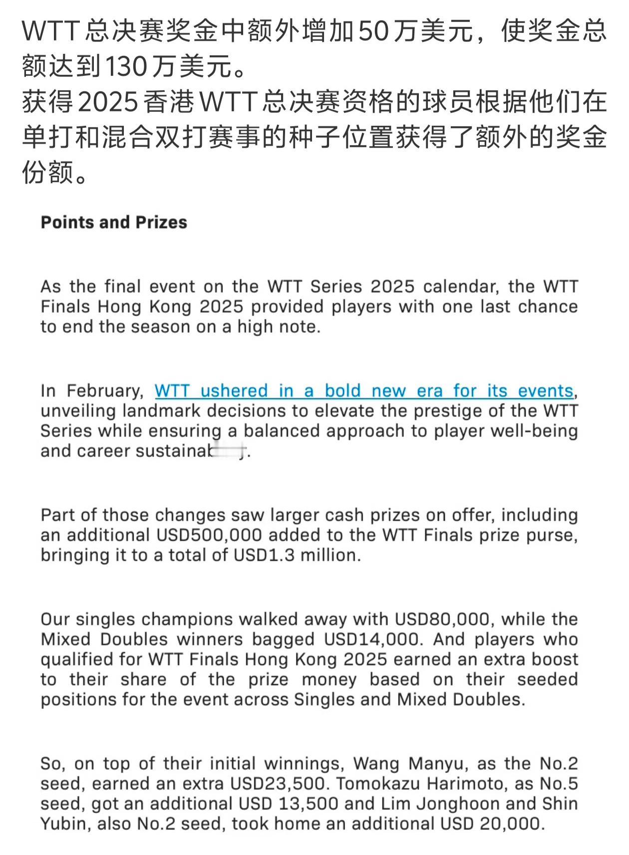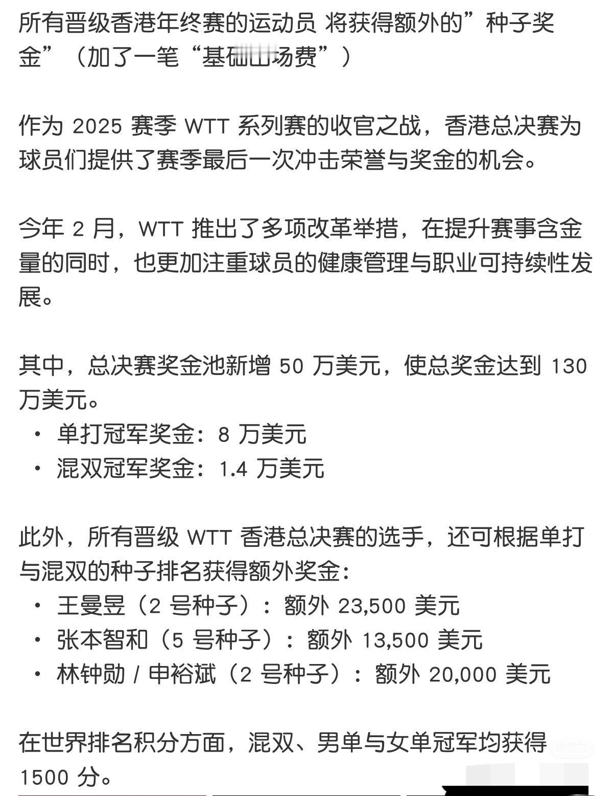 王曼昱一场总决赛冠军 奖金达到72万RMB WTT总决赛奖金中额外增加50万💲使奖金达总额达到130万💲! 就是在公示的奖金基础上, 又给每一位种子选手 加了额外奖金! 王曼昱最近两个多月, 以势不可挡之气势 拿下北京大满贯女单,女双冠军🏆, 全运会女单冠军🏆, 成都混团团体冠军🏆, 总决赛女单冠军🏆, 实打实的实力派, 还有一个南京乒超总决赛, 王曼昱加油! 话说混双种子位额外获得的奖金 比混双冠军的还多, 混双冠军的奖金是不是太少啦, 所有种子选手都有奖金, 不愧是总决赛, 不仅奖金丰厚, 还有年终奖! 国乒加油, 争取2026年都取得好成绩!